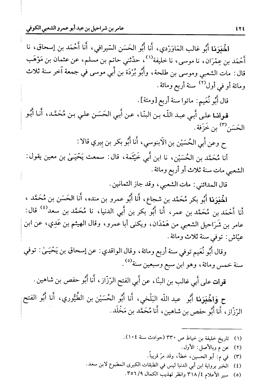 أخبرنا أبو غالب الماوردي أنا أبو الحسن السيرافي أنا أحمد بن إسحاق نا أحمد بن عمران نا موسى نا خليفة (1) حدثني حاتم بن مسلم عن عثمان بن موهب قال مات الشعبي وموسى بن طلحة وأبو بردة بن أبي موسى في جمعة آخر سنة ثلاث ومائة أو في أول (2) سنة أربع ومائة قال أبو نعيم ماتوا سنة أربع ومئة قرأنا على أبي عبد الله بن البنا عن أبي الحسن علي بن محمد أنا أبو الحسن (3) بن خزفة ح وعن أبي الحسين بن الآبنوسي أنا أبو بكر بن بيري قالا أنا محمد بن الحسين نا ابن أبي خيثمة قال سمعت يحيى بن معين يقول الشعبي مات سنة ثلاث أو أربع ومائة قال المدائني مات الشعبي وقد جاز الثمانين أخبرنا أبو بكر محمد بن شجاع أنا أبو عمرو بن منده أنا الحسن بن محمد أنا أحمد بن محمد بن عمر أنا أبو بكر بن أبي الدنيا نا محمد بن سعد (4) قال: عامر بن شراحيل الشعبي من همدان ويكنى أبا عمرو وقال الهيثم بن عدي عن ابن عياش توفي سنة ثلاث ومائة وقال أبو نعيم توفي سنة أربع ومائة وقال الواقدي عن إسحاق بن يحيى توفي سنة خمس ومائة وهو ابن سبع وسبعين سنة (5)