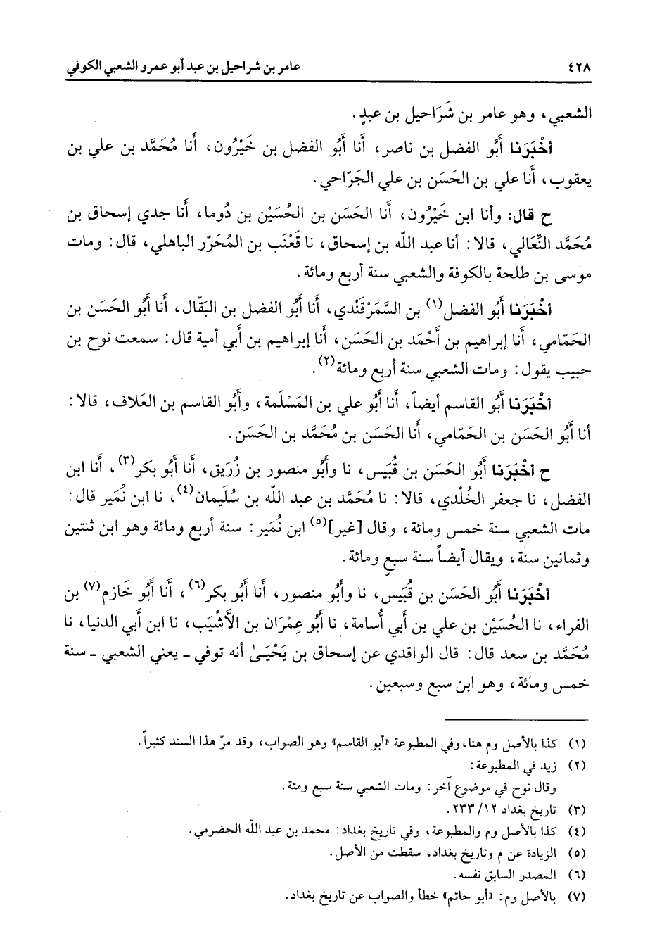 أخبرنا أبو القاسم أيضا أنا أبو علي بن المسلمة وأبو القاسم بن العلاف قالا أنا أبو الحسن بن الحمامي أنا الحسن بن محمد بن الحسن ح أخبرنا أبو الحسن بن قبيس نا وأبو منصور بن زريق أنا أبو بكر (3) أنا ابن الفضل نا جعفر الخلدي قالا نا محمد بن عبد الله بن سليمان (4) نا ابن نمير قال مات الشعبي سنة خمس ومائة وقال غير (5) ابن نمير سنة أربع ومائة وهو ابن ثنتين وثمانين سنة ويقال أيضا سنة سبع ومائة أخبرنا أبو الحسن بن قبيس نا وأبو منصور أنا أبو بكر (6) أنا أبو خازم (7) بن الفراء نا الحسين بن علي بن أبي أسامة نا أبو عمران بن الأشيب نا ابن أبي الدنيا نا محمد بن سعد قال قال الواقدي عن إسحاق بن يحيى أنه توفي يعني الشعبي سنة خمس ومائة وهو ابن سبع وسبعين