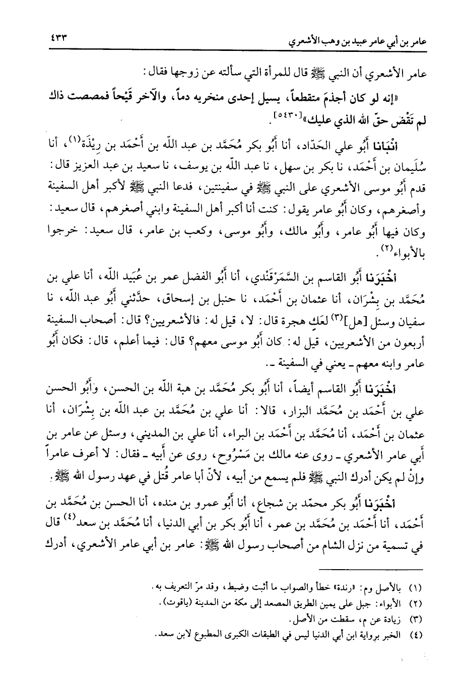 عامر الأشعري أن النبي (صلى الله عليه وسلم) قال للمرأة التي سألته عن زوجها فقال إنه لو كان أجذم متقطعا يسيل إحدى منخريه دما والآخر قيحا فمصصت ذاك لم تقض حق الله الذي عليك أنبأنا أبو علي الحداد أنا أبو بكر محمد بن عبد الله بن أحمد بن ريذة (1) أنا سليمان بن أحمد نا بكر بن سهل نا عبد الله بن يوسف نا سعيد بن عبد العزيز قال قدم أبو موسى الأشعري على النبي (صلى الله عليه وسلم) في سفينتين فدعا النبي (صلى الله عليه وسلم) لأكبر أهل السفينة وأصغرهم وكان أبو عامر يقول كنت أنا أكبر أهل السفينة وابني أصغرهم قال سعيد وكان فيها أبو عامر وأبو مالك وأبو موسى وكعب بن عامر قال سعيد خرجوا بالأبواء (2) أخبرنا أبو القاسم بن السمرقندي أنا أبو الفضل عمر بن عبيد الله أنا علي بن محمد بن بشران أنا عثمان بن أحمد نا حنبل بن إسحاق حدثني أبو عبد الله نا سفيان وسئل هل (3) لعك هجرة قال لا قيل له فالأشعريين قال أصحاب السفينة أربعون من الأشعريين قيل له كان أبو موسى معهم قال فيما أعلم قال فكان أبو عامر وابنه معهم يعني في السفينة أخبرنا أبو القاسم أيضا أنا أبو بكر محمد بن هبة الله بن الحسن وأبو الحسن علي بن أحمد بن محمد البزار قالا أنا علي بن محمد بن عبد الله بن بشران أنا عثمان بن أحمد أنا محمد بن أحمد بن البراء أنا علي بن المديني وسئل عن عامر بن أبي عامر الأشعري روى عنه مالك بن مسروح روى عن أبيه فقال لا أعرف عامرا وإن لم يكن أدرك النبي (صلى الله عليه وسلم) فلم يسمع من أبيه لأن أبا عامر قتل في عهد رسول الله (صلى الله عليه وسلم) أخبرنا أبو بكر محمد بن شجاع أنا أبو عمرو بن منده أنا الحسن بن محمد بن أحمد أنا أحمد بن محمد بن عمر أنا أبو بكر بن أبي الدنيا أنا محمد بن سعد (4) قال في تسمية من نزل الشام من أصحاب رسول الله (صلى الله عليه وسلم) عامر بن أبي عامر الأشعري أدرك