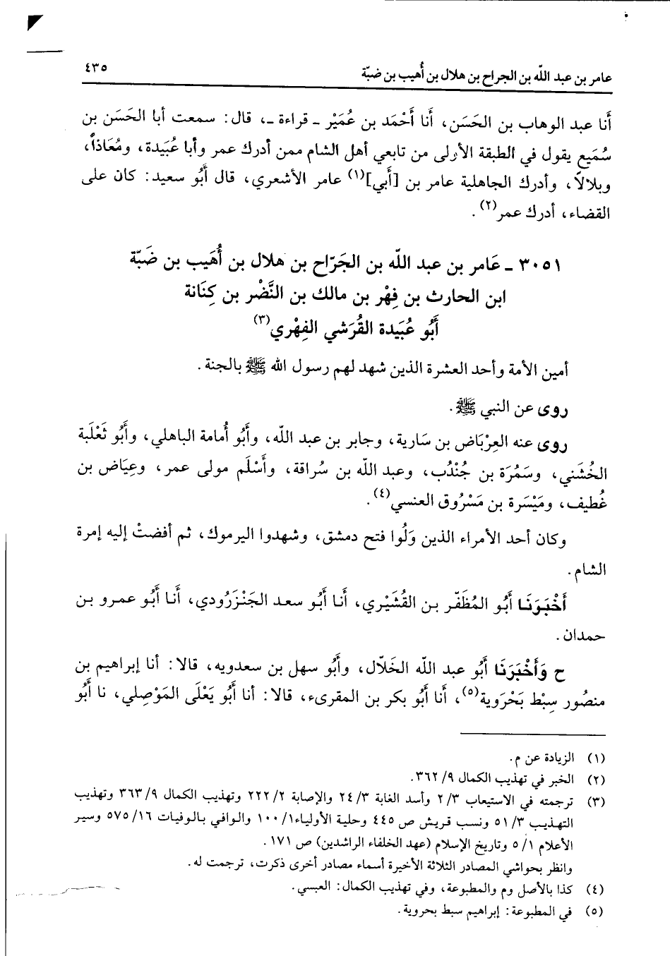 3051 - عامر بن عبد الله بن الجراح بن هلال بن أهيب بن ضبة ابن الحارث بن فهر بن مالك بن النضر بن كنانة أبو عبيدة القرشي الفهري (3) أمين الأمة وأحد العشرة الذين شهد لهم رسول الله (صلى الله عليه وسلم) بالجنة روى عن النبي (صلى الله عليه وسلم) روى عنه العرباض بن سارية وجابر بن عبد الله وأبو أمامة الباهلي وأبو ثعلبة الخشني وسمرة بن جندب وعبد الله بن سراقة وأسلم مولى عمر وعياض بن غطيف وميسرة بن مسروق العنسي (4)