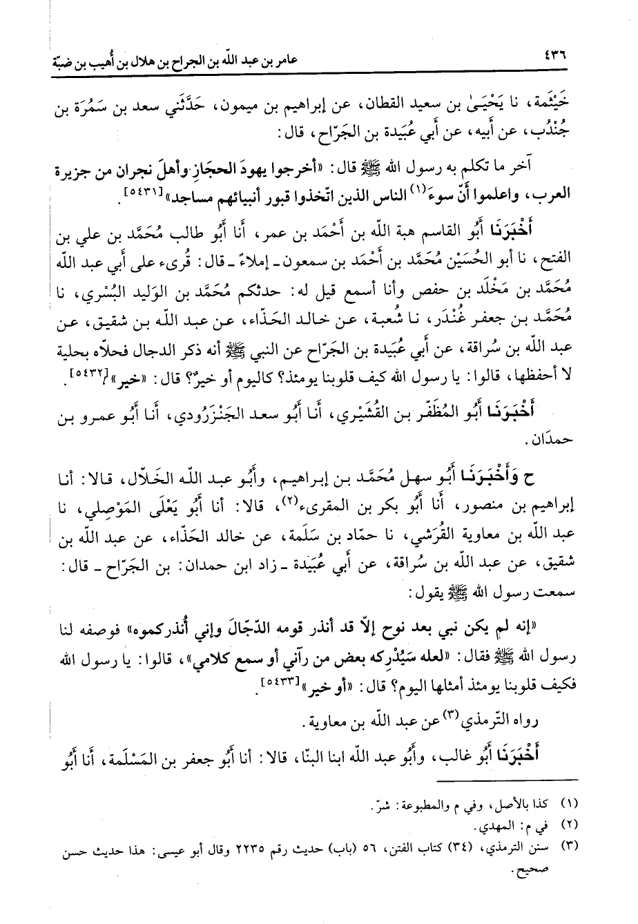 خيثمة نا يحيى بن سعيد القطان عن إبراهيم بن ميمون حدثني سعد بن سمرة بن جندب عن أبيه عن أبي عبيدة بن الجراح قال آخر ما تكلم به رسول الله (صلى الله عليه وسلم) قال أخرجوا يهود الحجاز وأهل نجران من جزيرة العرب واعلموا أن سوء (1) الناس الذين اتخذوا قبور أنبيائهم مساجد أخبرنا أبو القاسم هبة الله بن أحمد بن عمر أنا أبو طالب محمد بن علي بن الفتح نا أبو الحسين محمد بن أحمد بن سمعون إملاء قال قرئ على أبي عبد الله محمد بن مخلد بن حفص وأنا أسمع قيل قيل له حدثكم محمد بن الوليد البسري نا محمد بن جعفر غندر نا شعبة عن خالد الحذاء عن عبد الله بن شقيق عن عبد الله بن سراقة عن أبي عبيدة بن الجراح عن النبي (صلى الله عليه وسلم) أنه ذكر الدجال فحلاه بحلية لا أحفظها قالوا يا رسول الله كيف قلوبنا يومئذ كاليوم أو خير قال خير أخبرنا أبو المظفر بن القشيري أنا أبو سعد الجنزرودي أنا أبو عمرو بن حمدان ح وأخبرنا أبو سهل محمد بن إبراهيم وأبو عبد الله الخلال قالا أنا إبراهيم بن منصور أنا أبو بكر بن المقرئ (2) قالا أنا أبو يعلى الموصلي نا عبد الله بن معاوية القرشي نا حماد بن سلمة عن خالد الحذاء عن عبد الله بن شقيق عن عبد الله بن سراقة عن أبي عبيدة زاد ابن حمدان بن الجراح قال سمعت رسول الله (صلى الله عليه وسلم) يقول إنه لم يكن نبي بعد نوح إلا قد أنذر قومه الدجال وإني أنذركموه فوصفه لنا رسول الله (صلى الله عليه وسلم) فقال لعله سيدركه بعض من رآني أو سمع كلامي قالوا يا رسول الله فكيف قلوبنا يومئذ أمثلها اليوم قال أو خير رواه الترمذي (3) عن عبد الله بن معاوية أخبرنا أبو غالب وأبو عبد الله ابنا البنا قالا أنا أبو جعفر بن المسلمة أنا أبو