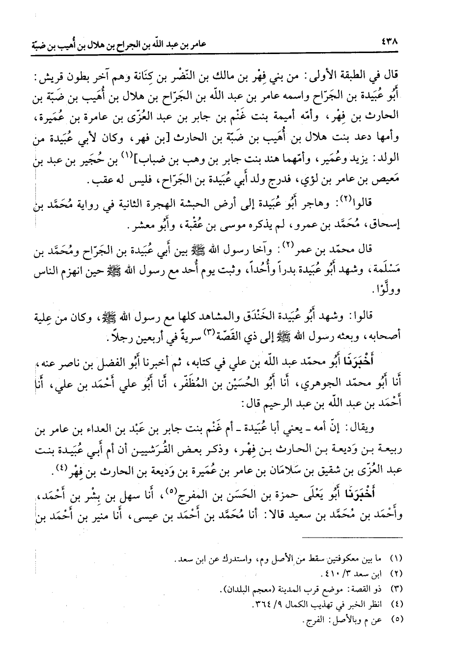قال في الطبقة الأولى من بني فهر بن مالك بن النضر بن كنانة وهم آخر بطون قريش أبو عبيدة بن الجراح واسمه عامر بن عبد الله بن الجراح بن هلال بن أهيب بن ضبة بن الحارث بن فهر وأمه أميمة بنت غنم بن جابر بن عبد العزى بن عامرة بن عميرة وأمها دعد بنت هلال بن أهيب بن ضبة بن الحارث بن فهر وكان لأبي عبيدة من الولد يزيد وعمير وأمهما هند بنت جابر بن وهب بن ضباب (1) بن حجير بن عبد بن معيص بن عامر بن لؤي فدرج ولد أبي عبيدة بن الجراح فليس له عقب قالوا (2) وهاجر أبو عبيدة إلى أرض الحبشة الهجرة الثانية في رواية محمد بن إسحاق محمد بن عمرو لم يذكره موسى بن عقبة وأبو معشر قال محمد بن عمر (2) : وآخا رسول الله (صلى الله عليه وسلم) بين أبي عبيدة بن الجراح ومحمد بن مسلمة وشهد أبو عبيدة بدرا وأحدا وثبت يوم أحد مع رسول الله (صلى الله عليه وسلم) حين انهزم الناس وولوا قالوا وشهد أبو عبيدة الخندق والمشاهد كلها مع رسول الله (صلى الله عليه وسلم) وكان من علية أصحابه وبعثه رسول الله (صلى الله عليه وسلم) إلى ذي القصة (3) سرية في أربعين رجلا أخبرنا أبو محمد عبد الله بن علي في كتابه ثم أخبرنا أبو الفضل بن ناصر عنه أنا أبو محمد الجوهري أنا أبو الحسين بن المظفر أنا أبو علي أحمد بن علي أنا أحمد بن عبد الله بن عبد الرحيم قال ويقال إن أمه يعني أبا عبيدة أم غنم بنت جابر بن عبد بن العداء بن عامر بن ربيعة بن وديعة بن الحارث بن فهر وذكر بعض القرشيين أن أم أبي عبيدة بنت عبد العزى بن شقيق بن سلامان بن عامر بن عميرة بن وديعة بن الحارث بن فهر (4)