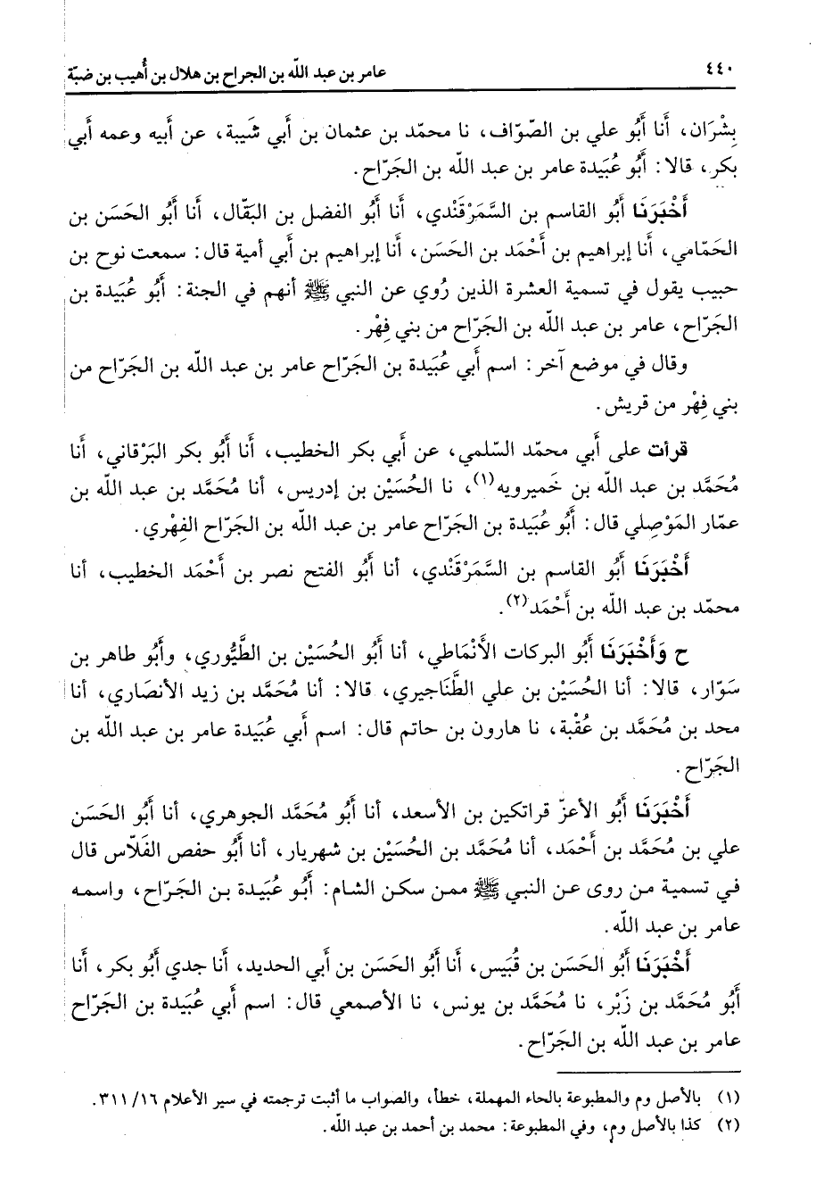 بشران أنا أبو علي بن الصواف نا محمد بن عثمان بن أبي شيبة عن أبيه وعمه أبي بكر قالا أبو عبيدة عامر بن عبد الله بن الجراح أخبرنا أبو القاسم بن السمرقندي أنا أبو الفضل بن البقال أنا أبو الحسن بن الحمامي أنا إبراهيم بن أحمد بن الحسن أنا إبراهيم بن أبي أمية قال سمعت نوح بن حبيب يقول في تسمية العشرة الذين روي عن النبي (صلى الله عليه وسلم) أنهم في الجنة أبو عبيدة بن الجراح عامر بن عبد الله بن الجراح من بني فهر وقال في موضع آخر اسم أبي عبيدة بن الجراح عامر بن عبد الله بن الجراح من بني فهر من قريش قرأت على أبي محمد السلمي عن أبي بكر الخطيب أنا أبو بكر البرقاني أنا محمد بن عبد الله بن خميرويه (1) نا الحسين بن إدريس أنا محمد بن عبد الله بن عمار الموصلي قال أبو عبيدة بن الجراح عامر بن عبد الله بن الجراح الفهري أخبرنا أبو القاسم بن السمرقندي أنا أبو الفتح نصر بن أحمد الخطيب أنا محمد بن عبد الله بن أحمد (2)