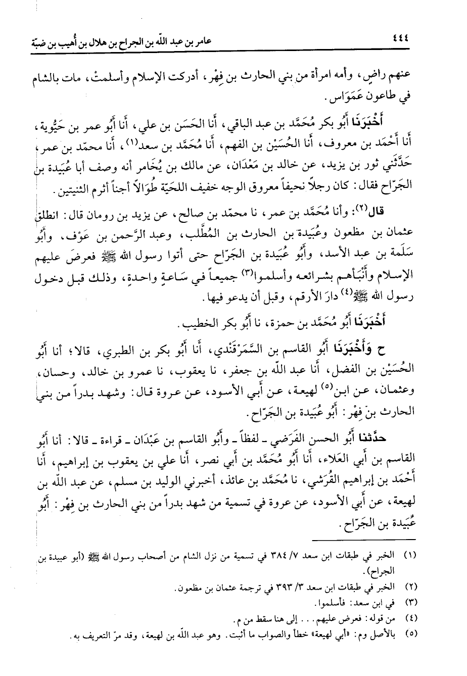 (1) الخبر في طبقات ابن سعد 7 / 384 في تسمية من نزل الشام من أصحاب رسول الله صلى الله عليه وآله وسلم (أبو عبيدة بن الجراح)