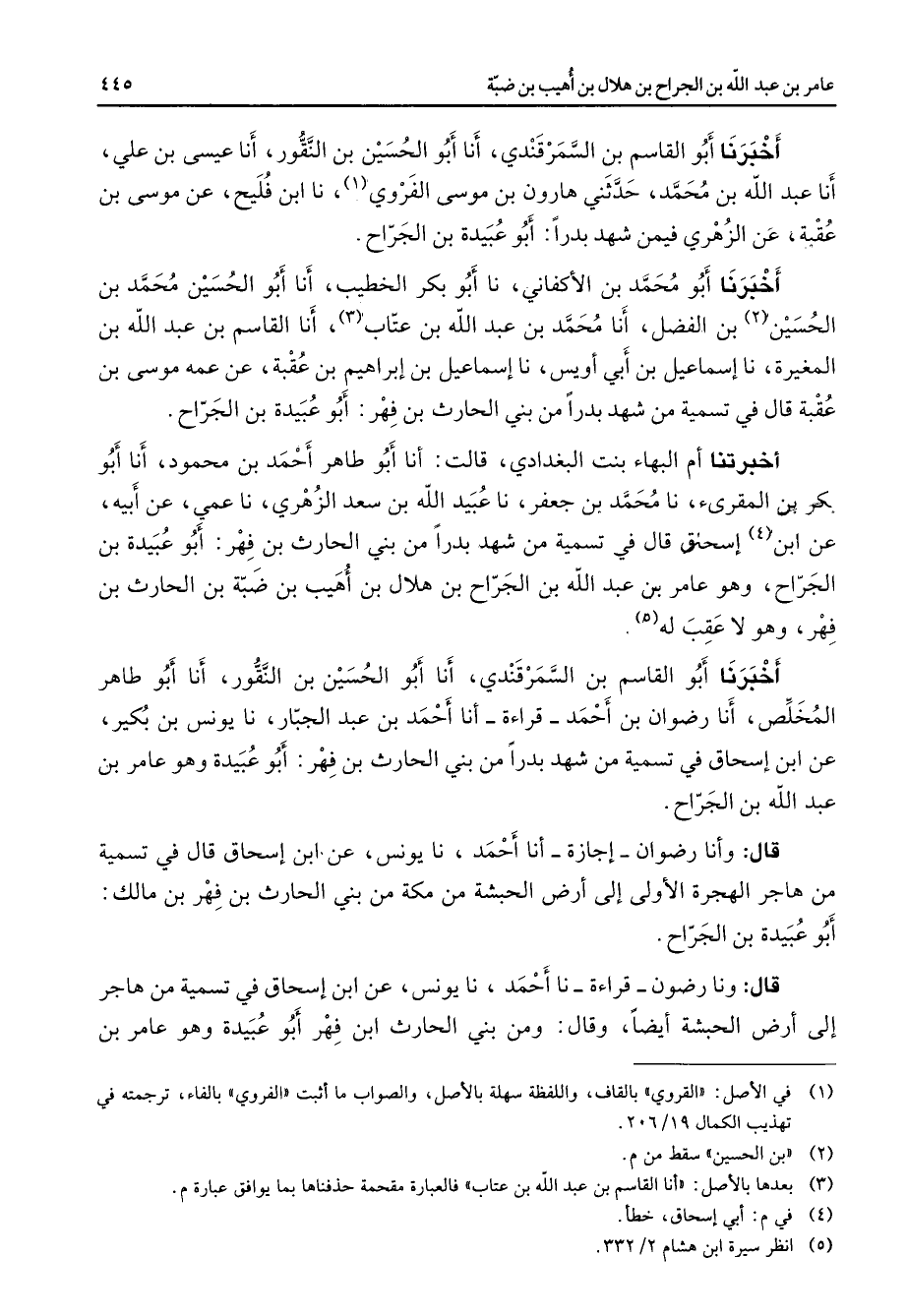 أخبرنا أبو القاسم بن السمرقندي أنا أبو الحسين بن النقور أنا أبو طاهر المخلص أنا رضوان بن أحمد قراءة أنا أحمد بن عبد الجبار نا يونس بن بكير عن ابن إسحاق في تسمية من شهد بدرا من بني الحارث بن فهر أبو عبيدة وهو عامر بن عبد الله بن الجراح قال وأنا رضوان إجازة أنا أحمد نا يونس عن ابن إسحاق قال في تسمية من هاجر الهجرة الأولى إلى أرض الحبشة من مكة من بني الحارث بن فهر بن مالك أبو عبيدة بن الجراح قال ونا رضوان قراءة نا أحمد نا يونس عن ابن إسحاق في تسمية من هاجر إلى أرض الحبشة أيضا وقال ومن بني الحارث ابن فهر أبو عبيدة وهو عامر بن