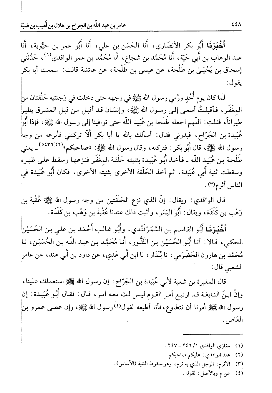 أخبرنا أبو بكر الأنصاري أنا الحسن بن علي أنا أبو عمر بن حيوية أنا عبد الوهاب بن أبي حية أنا محمد بن شجاع أنا محمد بن عمر الواقدي (1) حدثني إسحاق بن يحيى بن طلحة عن عيسى بن طلحة عن عائشة قالت سمعت أبا بكر يقول: لما كان يوم ورمي رسول الله (صلى الله عليه وسلم) في وجهه حتى دخلت في وجنتيه حلقتان من المغفر فأقبلت أسعى إلى رسول الله (صلى الله عليه وسلم) وإنسان قد أقبل من قبل المشرق يطير طيرانا فقلت اللهم اجعله طلحة بن عبيد الله حتى توافينا إلى رسول الله (صلى الله عليه وسلم) فإذا أبو عبيدة بن الجراح فبدرني فقال أسألك بالله يا أبا بكر ألا تركتني فأنزعه من وجه رسول الله (صلى الله عليه وسلم) قال أبو بكر فتركته وقال رسول الله (صلى الله عليه وسلم) صاحبكم يعني طلحة بن عبيد الله فأخذ أبو عبيدة بثنيته حلقة المغفر فنزعها وسقط على ظهره وسقطت ثنية أبي عبيدة ثم أخذ الحلقة الأخرى بثنيته الأخرى فكان أبو عبيدة في الناس أثرم (3)