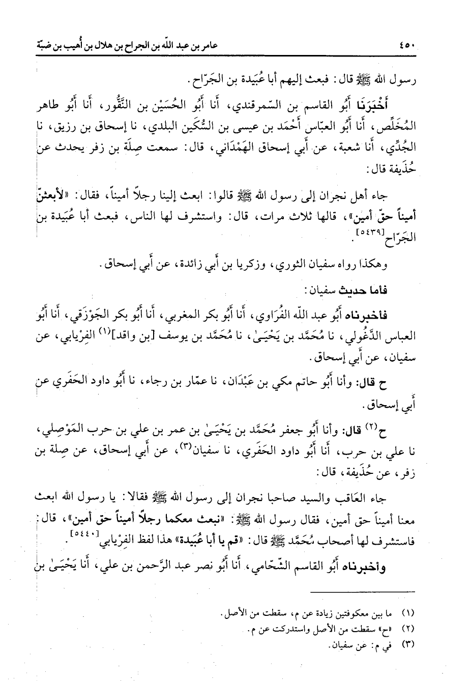 رسول الله (صلى الله عليه وسلم) قال فبعث إليهم أبا عبيدة بن الجراح أخبرنا أبو القاسم بن السمرقندي أنا أبو الحسين بن النقور أنا أبو طاهر المخلص أنا أبو العباس أحمد بن عيسى بن السكين البلدي نا إسحاق بن رزيق نا الجدي أنا شعبة عن أبي إسحاق الهمداني قال سمعت صلة بن زفر يحدث عن حذيفة قال جاء أهل نجران إلى رسول الله (صلى الله عليه وسلم) قالوا ابعث إلينا رجلا أمينا فقال لأبعثن أمينا حق أمين قالها ثلاث مرات قال واستشرف لها الناس فبعث أبا عبيدة بن الجراح وهكذا رواه سفيان الثوري وزكريا بن أبي زائدة عن أبي إسحاق فأما حديث سفيان فأخبرناه أبو عبد الله الفراوي أنا أبو بكر المغربي أنا أبو بكر الجوزقي أنا أبو العباس الدغولي نا محمد بن يحيى نا محمد بن يوسف بن واقد (2) الفريابي عن سفيان عن أبي إسحاق ح قال وأنا أبو حاتم مكي بن عبدان نا عمار بن رجاء نا أبو داود الحفري عن أبي إسحاق ح (2) قال وأنا أبو جعفر محمد بن يحيى بن عمر بن علي بن حرب الموصلي نا علي بن حرب أنا أبو داود الحفري نا سفيان (3) عن أبي إسحاق عن صلة بن زفر عن حذيفة قال: جاء العاقب والسيد صاحبا نجران إلى رسول الله (صلى الله عليه وسلم) فقالا يا رسول الله ابعث معنا أمينا حق أمين فقال رسول الله (صلى الله عليه وسلم) نبعث معكما رجلا أمينا حق أمين قال فاستشرف لها أصحاب محمد قال قم يا أبا عبيدة هذا لفظ الفريابي وأخبرناه أبو القاسم الشحامي أنا أبو نصر عبد الرحمن بن علي أنا يحيى بن