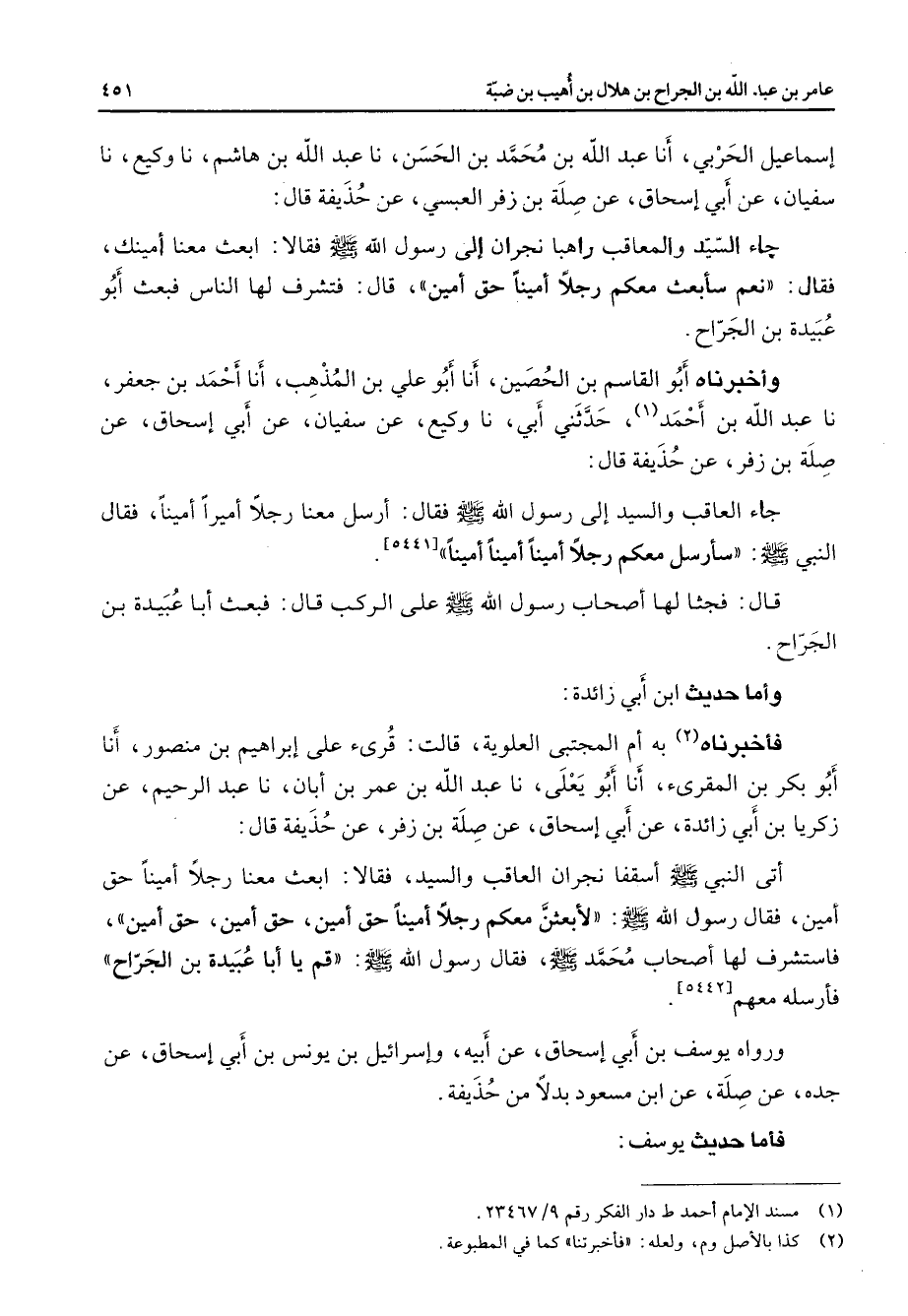 إسماعيل الحربي أنا عبد الله بن محمد بن الحسن نا عبد الله بن هاشم نا وكيع نا سفيان عن أبي إسحاق عن صلة بن زفر العبسي عن حذيفة قال جاء السيد والمعاقب راهبا نجران إلى رسول الله (صلى الله عليه وسلم) فقالا ابعث معنا أمينك فقال نعم سأبعث معكم رجلا أمينا حق أمين قال فتشرف لها الناس فبعث أبو عبيدة بن الجراح وأخبرناه أبو القاسم بن الحصين أنا أبو علي بن المذهب أنا أحمد بن جعفر نا عبد الله بن أحمد (1) حدثني أبي نا وكيع عن سفيان عن أبي إسحاق عن صلة بن زفر عن حذيفة قال جاء العاقب والسيد إلى رسول الله (صلى الله عليه وسلم) فقال أرسل معنا رجلا أميرا أمينا فقال النبي (صلى الله عليه وسلم) سأرسل معكم رجلا أمينا أمينا أمينا قال فجثا لها أصحاب رسول الله (صلى الله عليه وسلم) على الركب قال فبعث أبا عبيدة بن الجراح وأما حديث ابن أبي زائدة فأخبرناه (2) به أم المجتبى العلوية قالت قرئ على إبراهيم بن منصور أنا أبو بكر بن المقرئ أنا أبو يعلى نا عبد الله بن عمر بن أبان نا عبد الرحيم عن زكريا بن أبي زائدة عن أبي إسحاق عن صلة بن زفر عن حذيفة قال أتى النبي (صلى الله عليه وسلم) أسقفا نجران العاقب والسيد فقالا ابعث معنا رجلا أمينا حق أمين فقال رسول الله (صلى الله عليه وسلم) لأبعثن معكم رجلا أمينا حق أمين حق أمين حق أمين فاستشرف لها أصحاب محمد (صلى الله عليه وسلم) فقال رسول الله (صلى الله عليه وسلم) قم يا أبا عبيدة بن الجراح فأرسله معهم ورواه يوسف بن أبي إسحاق عن أبيه وإسرائيل بن يونس بن أبي إسحاق عن جده عن صلة عن ابن مسعود بدلا من حذيفة فأما حديث يوسف: