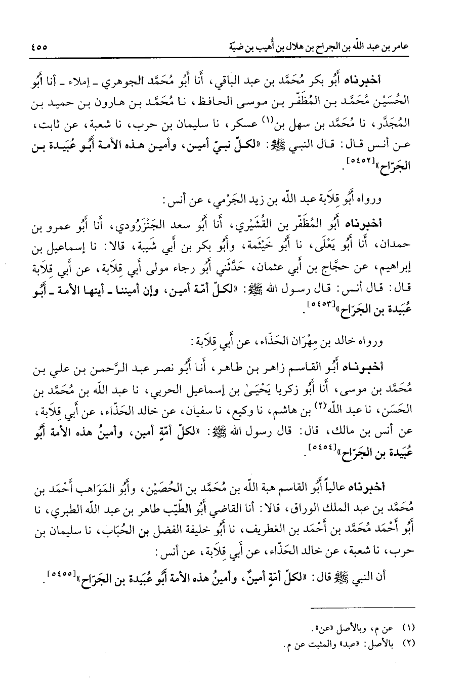 أخبرناه أبو بكر محمد بن عبد الباقي أنا أبو محمد الجوهري إملاء أنا أبو الحسين محمد بن المظفر بن موسى الحافظ نا محمد بن هارون بن حميد بن المجدر نا محمد بن سهل بن (1) عسكر نا سليمان بن حرب نا شعبة عن ثابت عن أنس قال قال النبي (صلى الله عليه وسلم) لكل نبي أمين وأمين هذه الأمة أبو عبيدة بن الجراح ورواه أبو قلابة عبد الله بن زيد الجرمي عن أنس أخبرناه أبو المظفر بن القشيري أنا أبو سعد الجنزرودي أنا أبو عمرو بن حمدان أنا أبو يعلى نا أبو خيثمة وأبو بكر بن أبي شيبة قالا نا إسماعيل بن إبراهيم عن حجاج بن أبي عثمان حدثني أبو رجاء مولى أبي قلابة عن أبي قلابة قال قال أنس قال رسول الله (صلى الله عليه وسلم) لكل أمة أمين وإن أميننا أيتها الأمة أبو عبيدة بن الجراح ورواه خالد بن مهران الحذاء عن أبي قلابة أخبرناه أبو القاسم زاهر بن طاهر أنا أبو نصر عبد الرحمن بن علي بن محمد بن موسى أنا أبو زكريا يحيى بن إسماعيل الحربي نا عبد الله بن محمد بن الحسن نا عبد الله (2) بن هاشم نا وكيع نا سفيان عن خالد الحذاء عن أبي قلابة عن أنس بن مالك قال قال رسول الله (صلى الله عليه وسلم) لكل أمة أمين وأمين هذه الأمة أبو عبيدة بن الجراح أخبرناه عاليا أبو القاسم هبة الله بن محمد بن الحصين وأبو المواهب أحمد بن محمد بن عبد الملك الوراق قالا أنا القاضي أبو الطيب طاهر بن عبد الله الطبري نا أبو أحمد محمد بن أحمد بن الغطريف نا أبو خليفة الفضل بن الحباب نا سليمان بن حرب نا شعبة عن خالد الحذاء عن أبي قلابة عن أنس أن النبي (صلى الله عليه وسلم) قال لكل أمة أمين وأمين هذه الأمة أبو عبيدة بن الجراح