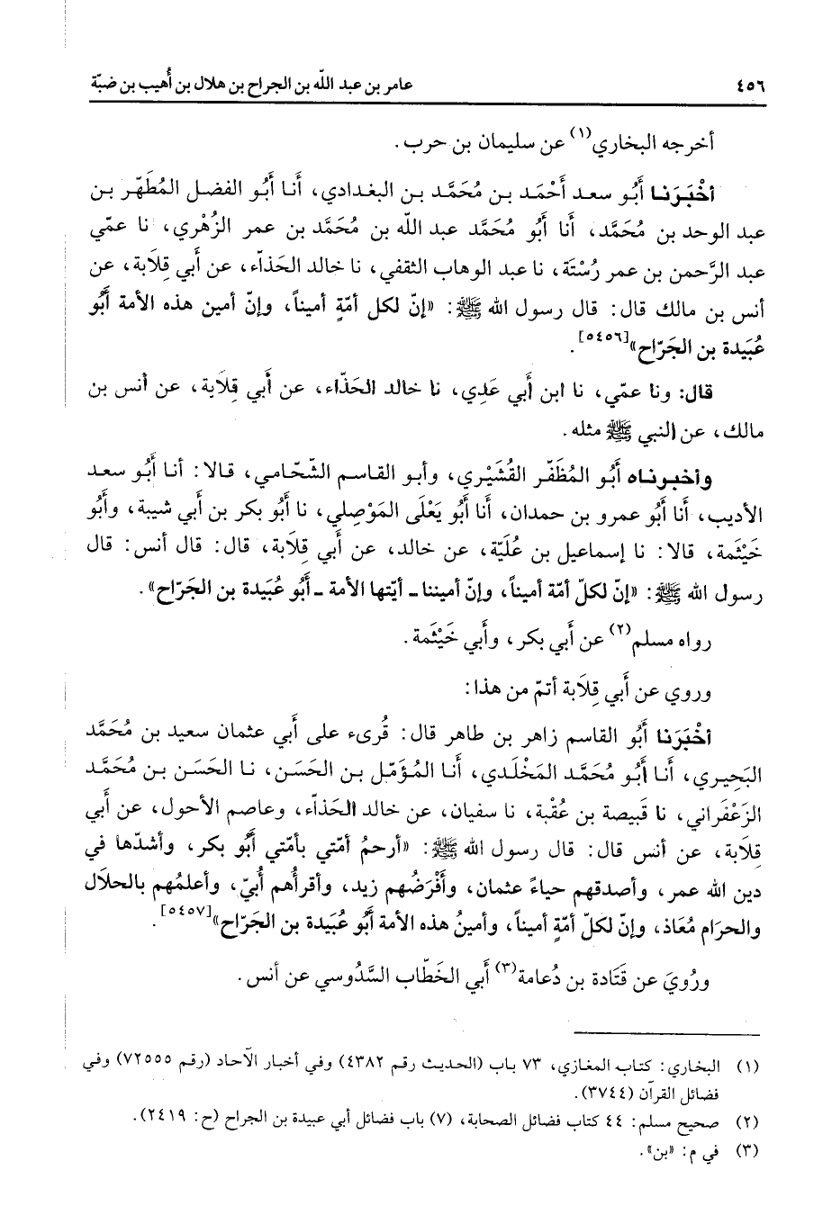 أخرجه البخاري (1) عن سليمان بن حرب أخبرنا أبو سعد أحمد بن محمد بن البغدادي أنا أبو الفضل المطهر بن عبد الواحد بن محمد أنا أبو محمد عبد الله بن محمد بن عمر الزهري نا عمي عبد الرحمن بن عمر رستة نا عبد الوهاب الثقفي نا خالد الحذاء عن أبي قلابة عن أنس بن مالك قال قال رسول الله (صلى الله عليه وسلم) إن لكل أمة أمينا وإن أمين هذه الأمة أبو عبيدة بن الجراح قال ونا عمي نا ابن أبي عدي نا خالد الحذاء عن أبي قلابة عن أنس بن مالك عن النبي (صلى الله عليه وسلم) مثله وأخبرناه أبو المظفر القشيري وأبو القاسم الشحامي قالا أنا أبو سعد الأديب أنا أبو عمرو بن حمدان أنا أبو يعلى الموصلي نا أبو بكر بن أبي شيبة وأبو خيثمة قالا نا إسماعيل بن علية عن خالد عن أبي قلابة قال قال أنس قال رسول الله (صلى الله عليه وسلم) إن لكل أمة أمينا وإن أميننا أيتها الأمة أبو عبيدة بن الجراح رواه مسلم (2) عن أبي بكر وأبي خيثمة وروي عن أبي قلابة أتم من هذا أخبرنا أبو القاسم زاهر بن طاهر قال قرئ على أبي عثمان سعيد بن محمد البحيري أنا أبو محمد المخلدي أنا المؤمل بن الحسن نا الحسن بن محمد الزعفراني نا قبيصة بن عقبة نا سفيان عن خالد الحذاء وعاصم الأحول عن أبي قلابة عن أنس قال قال رسول الله (صلى الله عليه وسلم) أرحم أمتي بأمتي أبو بكر وأشدها في دين الله عمر وأصدقهم حياء عثمان وأفرضهم زيد وأقرأهم أبي وأعلمهم بالحلال والحرام معاذ وإن لكل أمة أمينا وأمين هذه الأمة أبو عبيدة بن الجراح وروي عن قتادة بن دعامة (3) أبي الخطاب السدوسي عن أنس