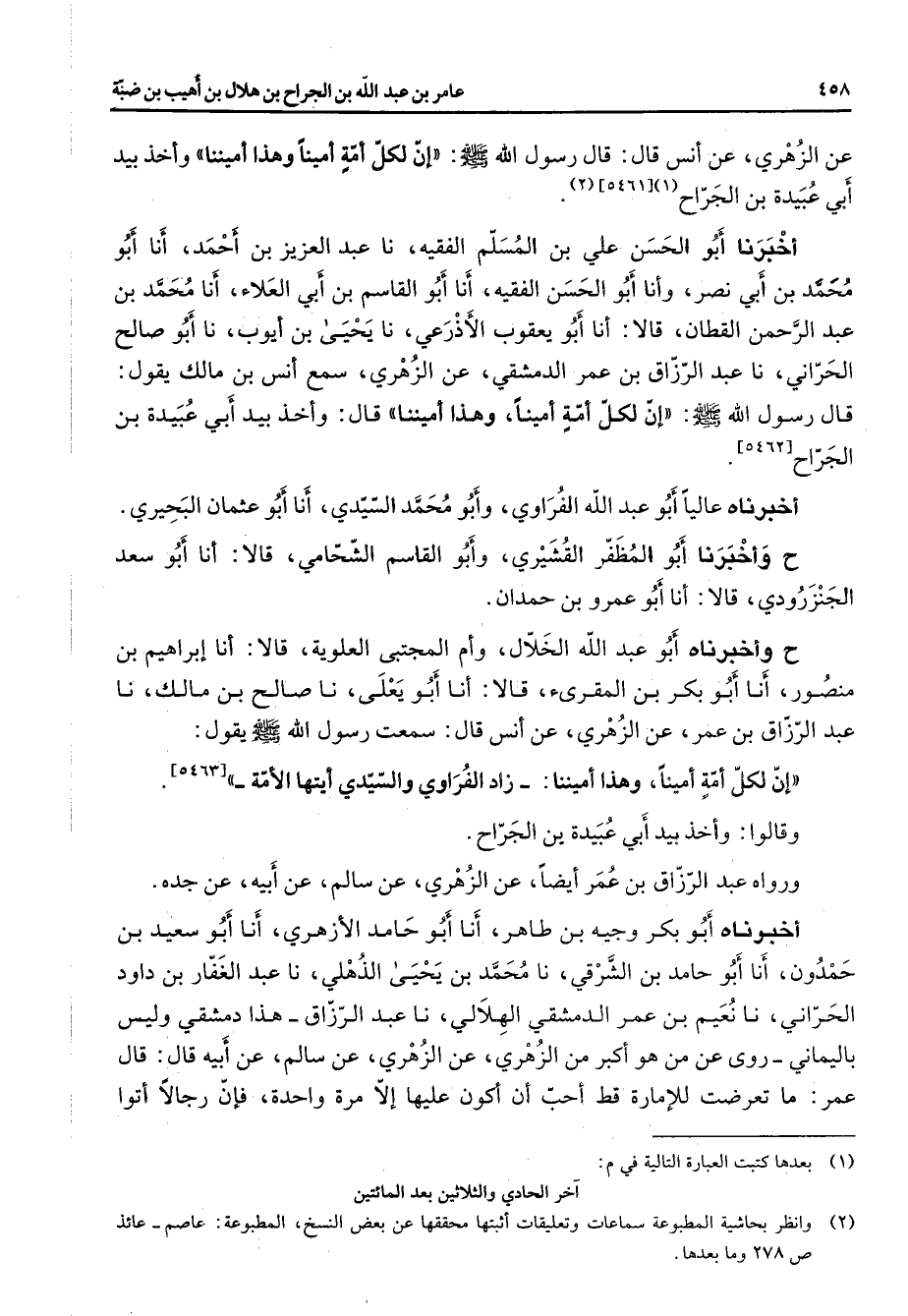 عن الزهري عن أنس قال قال رسول الله (صلى الله عليه وسلم) إن لكل أمة أمينا وهذا أميننا وأخذ بيد أبي عبيدة بن الجراح (1) (2)