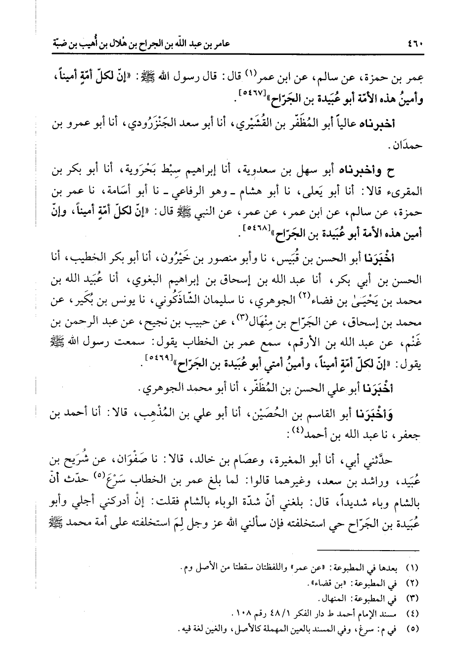 عمر بن حمزة عن سالم عن ابن عمر (1) قال قال رسول الله (صلى الله عليه وسلم) إن لكل أمة أمينا وأمين هذه الأمة أبو عبيدة بن الجراح أخبرناه عاليا أبو المظفر بن القشيري أنا أبو سعد الجنزرودي أنا أبو عمرو بن حمدان ح وأخبرناه أبو سهل بن سعدوية أنا إبراهيم سبط بحروية أنا أبو بكر بن المقرئ قالا أنا أبو يعلى نا أبو هشام وهو الرفاعي نا أبو أسامة نا عمرو بن حمزة عن سالم عن ابن عمر عن عمر عن النبي (صلى الله عليه وسلم) قال إن لكل أمة أمينا وإن أمين هذه الأمة أبو عبيدة بن الجراح أخبرنا أبو الحسن بن قبيس نا وأبو منصور بن خيرون أنا أبو بكر الخطيب أنا الحسن بن أبي بكر أنا عبد الله بن إسحاق بن إبراهيم البغوي أنا عبيد الله بن محمد بن يحيى بن فضاء (2) الجوهري نا سليمان الشاذكوني نا يونس بن بكير عن محمد بن إسحاق عن الجراح بن منهال (3) عن حبيب بن نجيح عن عبد الرحمن بن غنم عن عبد الله بن الأرقم سمع عمر بن الخطاب يقول سمعت رسول الله (صلى الله عليه وسلم) يقول إن لكل أمة أمينا وأمين أمتي أبو عبيدة بن الجراح أخبرنا أبو علي الحسن بن المظفر أنا أبو محمد الجوهري وأخبرنا أبو القاسم بن الحصين أنا أبو علي بن المذهب قالا أنا أحمد بن جعفر نا عبد الله بن أحمد (4)