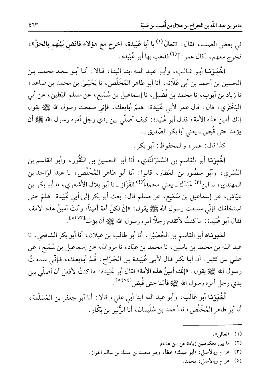 في بعض الصف فقال تعال (1) يا أبا عبيدة اخرج مع هؤلاء فاقض بينهم بالحق فخرج معهم قال عمر (2) فذهب بها أبو عبيدة أخبرنا أبو غالب وأبو عبد الله ابنا البنا قالا أنا أبو سعد محمد بن الحسين بن أحمد بن أبي علانة أنا أبو طاهر المخلص نا يحيى بن محمد بن صاعد نا زياد بن أيوب نا محمد بن فضيل نا إسماعيل بن سميع عن مسلم البطين عن أبي البختري قال قال عمر لأبي عبيدة هلم أبايعك فإني سمعت رسول الله (صلى الله عليه وسلم) يقول إنك أمين هذه الأمة فقال أبو عبيدة كيف أصلي بين يدي رجل أمره رسول الله (صلى الله عليه وسلم) أن يؤمنا حتى قبض يعني أبا بكر الصديق كذا قال عمر والمحفوظ أبو بكر أخبرنا أبو القاسم بن السمرقندي أنا أبو الحسين بن النقور وأبو القاسم بن البسري وأبو منصور بن العطار قالوا أنا أبو طاهر المخلص نا عبد الواحد بن المهتدي نا ابن (3) عبدك يعني محمدا (4) القزاز نا أبو بلال الأشعري نا أبو بكر بن عياش عن إسماعيل بن سميع عن مسلم قال بعث أبو بكر إلى أبي عبيدة هلم حتى استخلفك فإني سمعت رسول الله (صلى الله عليه وسلم) يقول إن لكل أمة أمينا وأنت أمين هذه الأمة فقال أبو عبيدة ما كنت لأتقدم رجلا أمره رسول الله (صلى الله عليه وسلم) أن يؤمنا أخبرناه أبو القاسم بن الحصين أنا أبو طالب بن غيلان أنا أبو بكر الشافعي نا عبد الله بن محمد بن ياسين نا محمد بن عباد نا مروان عن إسماعيل بن سميع عن علي بن كثير أن أبا بكر قال لأبي عبيدة بن الجراح قم أبايعك فإني سمعت رسول الله (صلى الله عليه وسلم) يقول إنك أمين هذه الأمة فقال أبو عبيدة ما كنت لأفعل أن أصلي بين يدي رجل أمره رسول الله (صلى الله عليه وسلم) فأمنا حتى قبض أخبرنا أبو غالب وأبو عبد الله ابنا أبي علي قالا أنا أبو جعفر بن المسلمة أنا أبو طاهر المخلص نا أحمد بن سليمان أنا الزبير بن بكار