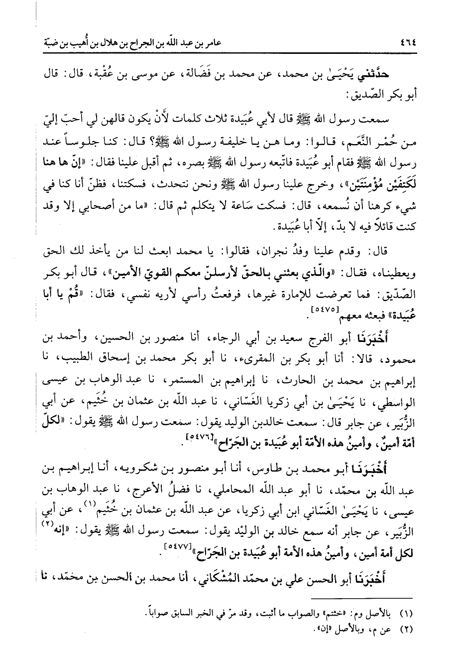 حدثني يحيى بن محمد عن محمد بن فضالة عن موسى بن عقبة قال قال أبو بكر الصديق سمعت رسول الله (صلى الله عليه وسلم) قال لأبي عبيدة ثلاث كلمات لأن يكون قالهن لي أحب إلي من حمر النعم قالوا وما هن يا خليفة رسول الله (صلى الله عليه وسلم) قال كنا جلوسا عند رسول الله (صلى الله عليه وسلم) فقام أبو عبيدة فاتبعه رسول الله بصره ثم أقبل علينا فقال إن ها هنا لكتفين مؤمنتين وخرج علينا رسول الله (صلى الله عليه وسلم) ونحن نتحدث فسكتنا فظن أنا كنا في شئ كرهنا أن نسمعه قال فسكت ساعة لا يتكلم ثم قال ما من أصحابي إلا وقد كنت قائلا فيه لا بد إلا أبا عبيدة قال وقدم علينا وفد نجران فقالوا يا محمد ابعث لنا من يأخذ لك الحق ويعطيناه فقال والذي بعثني بالحق لأرسلن معكم القوي الأمين قال أبو بكر الصديق فما تعرضت للإمارة غيرها فرفعت رأسي لأريه نفسي فقال قم يا أبا عبيدة فبعثه معهم أخبرنا أبو الفرج سعيد بن أبي الرجاء أنا منصور بن الحسين وأحمد بن محمود قالا أنا أبو بكر بن المقرئ نا أبو بكر محمد بن إسحاق الطبيب نا إبراهيم بن محمد بن الحارث نا إبراهيم بن المستمر نا عبد الوهاب بن عيسى الواسطي نا يحيى بن أبي زكريا الغساني نا عبد الله بن عثمان بن خثيم عن أبي الزبير عن جابر قال سمعت خالد بن الوليد يقول سمعت رسول الله (صلى الله عليه وسلم) يقول لكل أمة أمين وأمين هذه الأمة أبو عبيدة بن الجراح أخبرنا أبو محمد بن طاوس أنا أبو منصور بن شكرويه أنا إبراهيم بن عبد الله بن محمد نا أبو عبد الله المحاملي نا فضل الأعرج نا عبد الوهاب بن عيسى نا يحيى الغساني ابن أبي زكريا عن عبد الله بن عثمان بن خثيم (1) عن أبي الزبير عن جابر أنه سمع خالد بن الوليد يقول سمعت رسول الله (صلى الله عليه وسلم) يقول إنه (2) لكل أمة أمين وأمين هذه الأمة أبو عبيدة بن الجراح أخبرنا أبو الحسن علي بن محمد المشكاني أنا محمد بن الحسن بن محمد نا