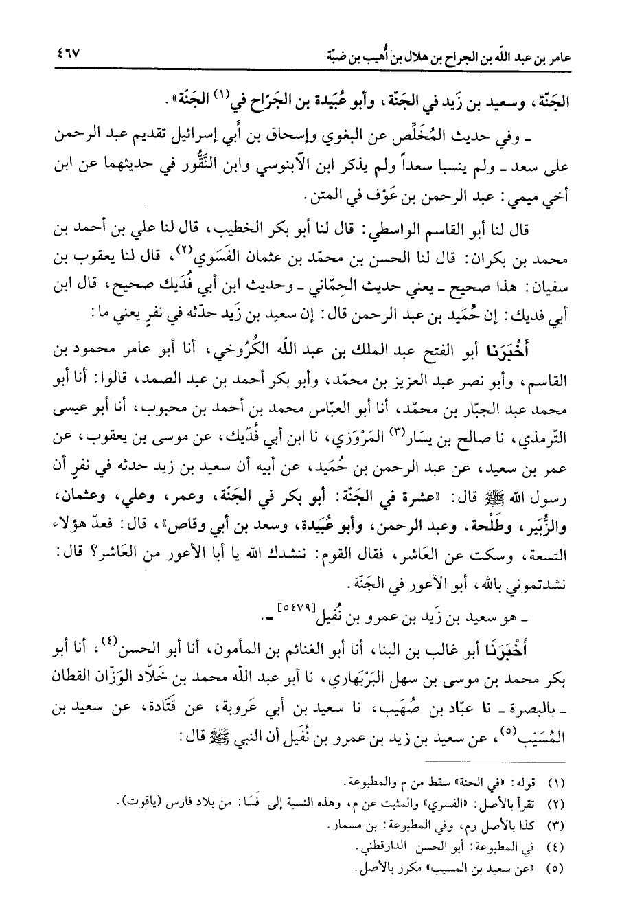 في الجنة وسعيد بن زيد في الجنة وأبو عبيدة بن الجراح في (1) الجنة وفي حديث المخلص عن البغوي وإسحاق بن أبي إسرائيل تقديم عبد الرحمن على سعد ولم ينسبا سعدا ولم يذكر ابن الآبنوسي وابن النقور في حديثهما عن ابن أخي ميمي عبد الرحمن بن عوف في المتن قال لنا أبو القاسم الواسطي قال لنا أبو بكر الخطيب قال لنا علي بن أحمد بن محمد بن بكران قال لنا الحسن بن محمد بن عثمان الفسوي (2) قال لنا يعقوب بن سفيان هذا صحيح يعني حديث الحماني وحديث ابن أبي فديك صحيح قال ابن أبي فديك إن حميد بن عبد الرحمن قال إن سعيد بن زيد حدثه في نفر يعني ما أخبرنا أبو الفتح عبد الملك بن عبد الله الكروخي أنا أبو عامر محمود بن القاسم وأبو نصر عبد العزيز بن محمد وأبو بكر أحمد بن عبد الصمد قالوا أنا أبو محمد عبد الجبار بن محمد أنا أبو العباس محمد بن أحمد بن محبوب أنا أبو عيسى الترمذي نا صالح بن يسار (3) المروزي نا ابن أبي فديك عن موسى بن يعقوب عن عمر بن سعيد عن عبد الرحمن بن حميد عن أبيه أن سعيد بن زيد حدثه في نفر أن رسول الله (صلى الله عليه وسلم) قال عشرة في الجنة أبو بكر في الجنة وعمر وعلي وعثمان والزبير وطلحة وعبد الرحمن وأبو عبيدة وسعد بن أبي وقاص قال فعد هؤلاء التسعة وسكت عن العاشر فقال القوم ننشدك الله يا أبا الأعور من العاشر قال نشدتموني بالله أبو الأعور في الجنة هو سعيد بن زيد بن عمرو بن نفيل أخبرنا أبو غالب بن البنا أنا أبو الغنائم بن المأمون أنا أبو الحسن (4) أنا أبو بكر محمد بن موسى بن سهل البربهاري نا أبو عبد الله محمد بن خلاد الوزان القطان بالبصرة نا عباد بن صهيب نا سعيد بن أبي عروبة عن قتادة عن سعيد بن المسيب (5) عن سعيد بن زيد بن عمرو بن نفيل أن النبي (صلى الله عليه وسلم) قال