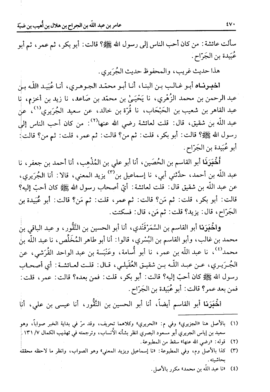 سألت عائشة من كان أحب الناس إلى رسول الله (صلى الله عليه وسلم) قالت أبو بكر ثم عمر ثم أبو عبيدة بن الجراح هذا حديث غريب والمحفوظ حديث الجريري أخبرناه أبو غالب بن البنا أنا أبو محمد الجوهري أنا عبيد الله بن عبد الرحمن بن محمد الزهري نا يحيى بن محمد بن صاعد نا زيد بن أخزم نا عبد القاهر بن شعيب بن الحبحاب نا قرة بن خالد عن سعيد الجريري (1) عن عبد الله بن شقيق قال قلت لعائشة Bها (2) : من كان أحب الناس إلى رسول الله (صلى الله عليه وسلم) قالت أبو بكر قلت ثم من قالت ثم عمر قلت ثم من قالت أبو عبيدة بن الجراح أخبرنا أبو القاسم بن الحصين أنا أبو علي بن المذهب أنا أحمد بن جعفر نا عبد الله بن أحمد حدثني أبي نا إسماعيل بن (3) يزيد المعني قالا أنا الجريري عن عبد الله بن شقيق قال قلت لعائشة أي أصحاب رسول الله (صلى الله عليه وسلم) كان أحب إليه قالت أبو بكر قلت ثم من قالت ثم عمر قلت ثم من قالت أبو عبيدة بن الجراح قال يزيد قلت ثم من قال فسكتت وأخبرنا أبو القاسم بن السمرقندي أنا أبو الحسين بن النقور وعبد الباقي بن محمد بن غالب وأبو القاسم بن البسري قالوا أنا أبو طاهر المخلص نا عبد الله بن محمد (4) نا عبد الله بن عمر نا أبو أسامة وعنبسة بن عبد الواحد القرشي عن الجريري عن عبد الله بن شقيق العقيلي قال قلت لعائشة أي أصحاب رسول الله (صلى الله عليه وسلم) كان أحب إليه قالت أبو بكر قلت فمن بعده قالت عمر قلت فمن بعده قالت أبو عبيدة بن الجراح أخبرنا أبو القاسم أيضا أنا أبو الحسين بن النقور أنا عيسى بن علي أنا