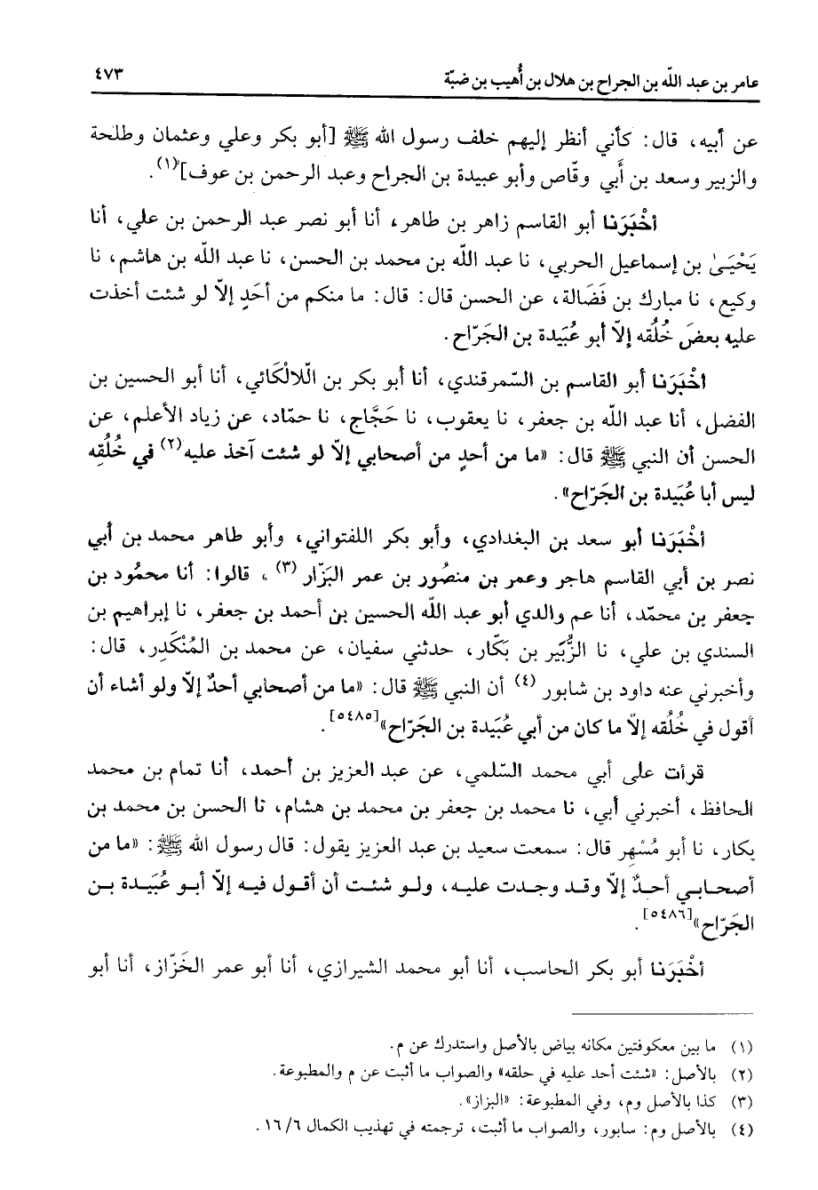 أخبرنا أبو القاسم زاهر بن طاهر أنا أبو نصر عبد الرحمن بن علي أنا يحيى بن إسماعيل الحربي نا عبد الله بن محمد بن الحسن نا عبد الله بن هاشم نا وكيع نا مبارك بن فضالة عن الحسن قال قال ما منكم من أحد إلا لو شئت أخذت عليه بعض خلقه إلا أبو عبيدة بن الجراح أخبرنا أبو القاسم بن السمرقندي أنا أبو بكر بن اللالكائي أنا أبو الحسين بن الفضل أنا عبد الله بن جعفر نا يعقوب نا حجاج نا حماد عن زياد الأعلم عن الحسن أن النبي (صلى الله عليه وسلم) قال ما من أحد من أصحابي إلا لو شئت آخذ عليه (2) في خلقه ليس أبا عبيدة بن الجراح أخبرنا أبو سعد بن البغدادي وأبو بكر اللفتواني وأبو طاهر محمد بن أبي نصر بن أبي القاسم هاجر وعمر بن منصور بن عمر البزار (3) قالوا أنا محمود بن جعفر بن محمد أنا عم والدي أبو عبد الله الحسين بن أحمد بن جعفر نا إبراهيم بن السندي بن علي نا الزبير بن بكار حدثني سفيان عن محمد بن المنكدر قال وأخبرني عنه داود بن شابور (4) أن النبي (صلى الله عليه وسلم) قال ما من أصحابي أحد إلا ولو أشاء أن أقول في خلقه إلا ما كان من أبي عبيدة بن الجراح قرأت على أبي محمد السلمي عن عبد العزيز بن أحمد أنا تمام بن محمد الحافظ أخبرني أبي نا محمد بن جعفر بن محمد بن هشام نا الحسن بن محمد بن بكار نا أبو مسهر قال سمعت سعيد بن عبد العزيز يقول قال رسول الله (صلى الله عليه وسلم) ما من أصحابي أحد إلا وقد وجدت عليه ولو شئت أن أقول فيه إلا أبو عبيدة بن الجراح أخبرنا أبو بكر الحاسب أنا أبو محمد الشيرازي أنا أبو عمر الخزاز أنا أبو