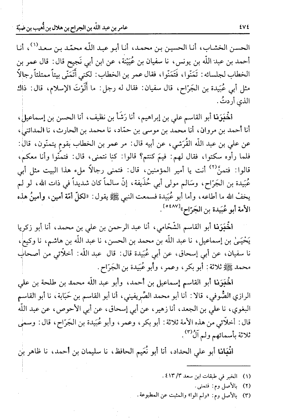 الحسن الخشاب أنا الحسين بن محمد أنا أبو عبد الله محمد بن سعد (1) أنا أحمد بن عبد الله بن يونس نا سفيان بن عيينة عن ابن أبي نجيح قال قال عمر بن الخطاب لجلسائه تمنوا فتمنوا فقال عمر بن الخطاب لكني أتمنى بيتا ممتلئا رجالا مثل أبي عبيدة بن الجراح قال سفيان فقال له رجل ما ألوت الإسلام قال ذاك الذي أردت أخبرنا أبو القاسم علي بن إبراهيم أنا رشأ بن نظيف أنا الحسن بن إسماعيل أنا أحمد بن مروان أنا محمد بن موسى بن حماد نا محمد بن الحارث نا المدائني عن علي بن عبد الله القرشي عن أبيه قال مر عمر بن الخطاب بقوم يتمنون قال فلما رأوه سكتوا فقال لهم فيم كنتم قالوا كنا نتمنى قال فتمنوا وأنا معكم قالوا فتمن (2) أنت يا أمير المؤمنين قال فتمنى رجالا ملء هذا البيت مثل أبي عبيدة بن الجراح وسالم مولى أبي حذيفة إن سالما كان شديدا في ذات الله لو لم يخف الله ما أطاعه وأما أبو عبيدة فسمعت النبي (صلى الله عليه وسلم) يقول لكل أمة أمين وأمين هذه الأمة أبو عبيدة بن الجراح أخبرنا أبو القاسم الشحامي أنا عبد الرحمن بن علي بن محمد أنا أبو زكريا يحيى بن إسماعيل نا عبد الله بن محمد بن الحسن نا عبد الله بن هاشم نا وكيع نا سفيان عن أبي إسحاق عن أبي عبيدة قال قال عبد الله أخلائي من أصحاب محمد (صلى الله عليه وسلم) ثلاثة أبو بكر وعمر وأبو عبيدة بن الجراح أخبرنا أبو القاسم إسماعيل بن أحمد وأبو عبد الله محمد بن طلحة بن علي الرازي الصوفي قالا أنا أبو محمد الصريفيني أنا أبو القاسم بن حبابة نا أبو القاسم البغوي نا علي بن الجعد أنا زهير عن أبي إسحاق عن أبي الأحوص عن عبد الله قال أخلائي من هذه الأمة ثلاثة أبو بكر وعمر وأبو عبيدة بن الجراح قال وسمى ثلاثة بأسمائهم ولم آل (3)