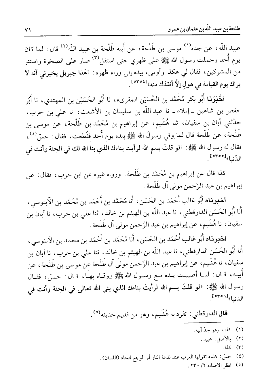 عبيد الله عن جده (1) موسى بن طلحة عن أبيه طلحة بن عبيد الله (2) قال لما كان يوم أحد وحملت رسول الله (صلى الله عليه وسلم) على ظهري حتى استقل (3) صار على الصخرة واستتر من المشركين فقال لي هكذا وأومئ بيده إلى وراء ظهره هذا جبريل يخبرني أنه لا يراك يوم القيامة في هول إلا أنقذك منه أخبرنا أبو بكر محمد بن الحسين المقرئ نا أبو الحسين بن المهتدي نا أبو حفص أبن شاهين إملاء نا عبد الله بن سليمان بن الأشعث نا علي بن حرب حدثني أبان بن سفيان ثنا هشيم عن إبراهيم بن محمد بن طلحة عن موسى بن طلحة عن طلحة قال لما وقي رسول الله (صلى الله عليه وسلم) بيده يوم أحد فقطعت فقال حس (4) فقال له رسول الله (صلى الله عليه وسلم) لو قلت بسم الله لرأيت بناءك الذي بنا الله لك في الجنة وأنت في الدنيا كذا قال عن إبراهيم بن محمد بن طلحة ورواه غيره عن ابن حرب فقال عن إبراهيم أبن عبد الرحمن مولى آل طلحة أخبرناه أبو غالب أحمد بن الحسن أنا محمد بن أحمد بن محمد بن الآبنوسي أنا أبو الحسن الدارقطني نا عبد الله بن الهيثم بن خالد ثنا علي بن حرب نا أبان بن سفيان نا هشيم عن إبراهيم بن عبد الرحمن مولى آل طلحة أخبرناه أبو غالب أحمد بن الحسن أنا محمد بن أحمد بن محمد بن الآبنوسي أنا أبو الحسن الدارقطني نا عبد الله بن الهيثم بن خالد ثنا علي بن حرب نا أبان بن سفيان نا هشيم عن إبراهيم بن عبد الرحمن مولى آل طلحة عن موسى بن طلحة عن أبيه قال لما أصيب يده مع رسول الله (صلى الله عليه وسلم) ووقاه بها قال حس فقال رسول الله (صلى الله عليه وسلم) لو قلت بسم الله لرأيت بناءك الذي بنى الله تعالى في الجنة وأنت في الدنيا قال الدارقطني تفرد به هشيم وهو من قديم حديثه (5)