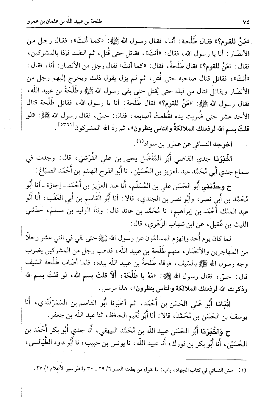 من للقوم فقال طلحة أنا فقال رسول الله (صلى الله عليه وسلم) كما أنت فقال رجل من الأنصار أنا يا رسول الله فقال أنت فقاتل حتى قتل ثم التفت فإذا بالمشركين فقال من للقوم فقال طلحة فقال كما أنت فقال رجل من الأنصار أنا فقال أنت فقاتل قتال صاحبه حتى قتل ثم لم يزل يقول ذلك ويخرج إليهم رجل من الأنصار ويقاتل قتال من قبله حتى يقتل حتى بقي رسول الله (صلى الله عليه وسلم) وطلحة بن عبيد الله فقال رسول الله (صلى الله عليه وسلم) من للقوم فقال طلحة أنا يا رسول الله فقاتل طلحة قتال الأحد عشر حتى ضربت يده فقطعت أصابعه فقال حس فقال رسول الله لو قلت بسم الله لرفعتك الملائكة والناس ينظرون ثم رد الله المشركون أخرجه النسائي عن عمرو بن سواد (1) أخبرنا جدي القاضي أبو المفضل يحيى بن علي القرشي قال وجدت في سماع جدي أبي محمد عبد العزيز بن الحسين نا أبو الفرج الهيثم بن أحمد الصباغ ح وحدثني أبو الحسن علي بن المسلم أنا عبد العزيز بن أحمد إجازة أنا أبو محمد أبن أبي نصر وأبو نصر بن الجندي قالا أنا أبو القاسم بن أبي العقب أنا أبو عبد الملك أحمد بن إبراهيم نا محمد بن عائذ قال وثنا الوليد بن مسلم حدثني الليث بن عقيل عن ابن شهاب الزهري قال لما كان يوم أحد وانهزم المسلمون عن رسول الله (صلى الله عليه وسلم) حتى بقي في اثني عشر رجلا من المهاجرين والأنصار منهم طلحة بن عبيد الله فذهب رجل من المشركين يضرب وجه رسول الله (صلى الله عليه وسلم) بالسيف فوقاه طلحة بن عبيد الله بيده فلما أصاب طلحة السيف قال حس فقال رسول الله (صلى الله عليه وسلم) مه يا طلحة ألا قلت بسم الله لو قلت بسم الله وذكرت الله لرفعتك الملائكة والناس ينظرون - هذا مرسل - أنبأنا أبو علي الحسن بن أحمد ثم أخبرنا أبو القاسم بن السمرقندي أنا يوسف بن الحسن بن محمد قالا أنا أبو نعيم الحافظ ثنا عبد الله بن جعفر ح وأخبرنا أبو الحسن عبيد الله بن محمد البيهقي أنا جدي أبو بكر أحمد بن الحسين أنا أبو بكر بن فورك أنا عبيد الله نا يونس بن حبيب نا أبو داود الطيالسي