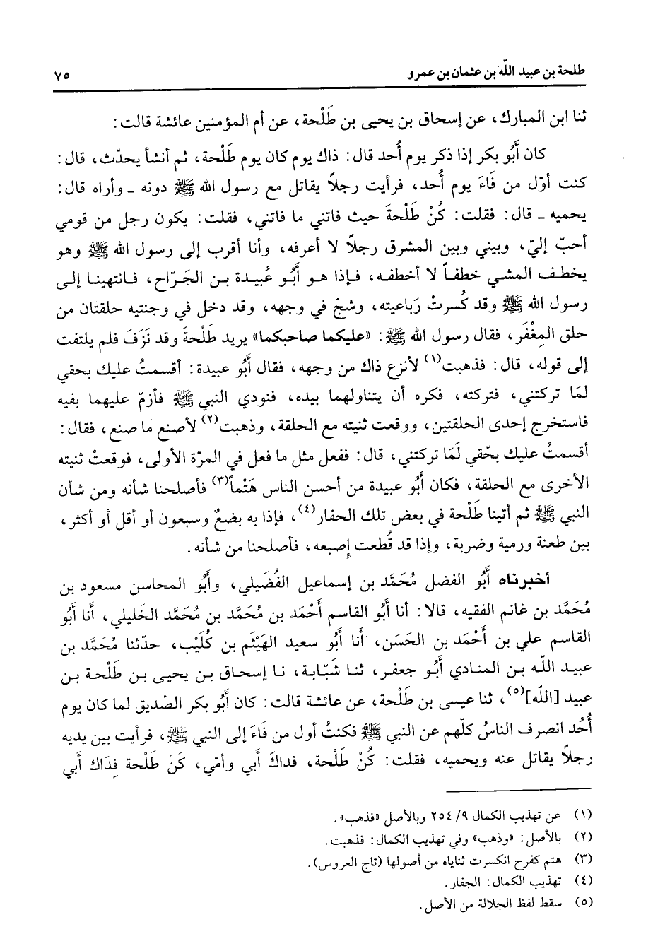 ثنا ابن المبارك عن إسحاق بن يحيى بن طلحة عن أم المؤمنين عائشة قالت كان أبو بكر إذا ذكر يوم أحد قال ذاك يوم كان يوم طلحة ثم أنشأ يحدث قال كنت أول من فاء يوم أحد فرأيت رجلا يقاتل مع رسول الله (صلى الله عليه وسلم) دونه وأراه قال يحميه قال فقلت كن طلحة حيث فاتني ما فاتني فقلت يكون رجل من قومي أحب إلي وبيني وبين المشرق رجلا لا أعرفه وأنا أقرب إلى رسول الله (صلى الله عليه وسلم) وهو يخطف المشي خطفا لا أخطفه فإذا هو أبو عبيدة أبن الجراح فانتهينا إلى رسول الله (صلى الله عليه وسلم) وقد كسرت رباعيته وشج في وجهه وقد دخل في وجنتيه حلقتان من حلق المغفر فقال رسول الله (صلى الله عليه وسلم) عليكما صاحبكما يريد طلحة وقد نزف فلم يلتفت إلى قوله قال فذهبت (1) لأنزع ذاك من وجهه فقال أبو عبيدة أقسمت عليك بحقي لما تركتني فتركته فكره أن يتناولها بيده فنودي النبي (صلى الله عليه وسلم) فأزم عليهما بفيه فاستخرج إحدى الحلقتين ووقعت ثنيته مع الحلقة وذهبت (2) لأصنع ما صنع فقال أقسمت عليك بحقي لما تركتني قال ففعل مثل ما فعل في المرة الأولى فوقعت ثنيته الأخرى مع الحلقة فكان أبو عبيدة من أحسن الناس هتما (3) فأصلحنا شأنه ومن شأن النبي (صلى الله عليه وسلم) ثم أتينا طلحة في بعض تلك الحفار (4) فإذا به بضع وسبعون أو أقل أو أكثر بين طعنة ورمية وضربة وإذا قد قطعت إصبعه فأصلحنا من شأنه أخبرناه أبو الفضل محمد بن إسماعيل الفضيلي وأبو المحاسن مسعود بن محمد بن غانم الفقيه قالا أنا أبو القاسم أحمد بن محمد بن محمد الخليلي أنا أبو القاسم علي أبن أحمد بن الحسن أنا أبو سعيد الهيثم بن كليب حدثنا محمد بن عبيد الله بن المنادي أبو جعفر ثنا شبابة نا إسحاق بن يحيى بن طلحة بن عبيد الله (5) ثنا عيسى بن طلحة عن عائشة قالت كان أبو بكر الصديق لما كان يوم أحد انصرف الناس كلهم عن النبي (صلى الله عليه وسلم) فكنت أول من فاء إلى النبي (صلى الله عليه وسلم) فرأيت بين يديه رجلا يقاتل عنه ويحميه فقلت كن طلحة فداك أبي