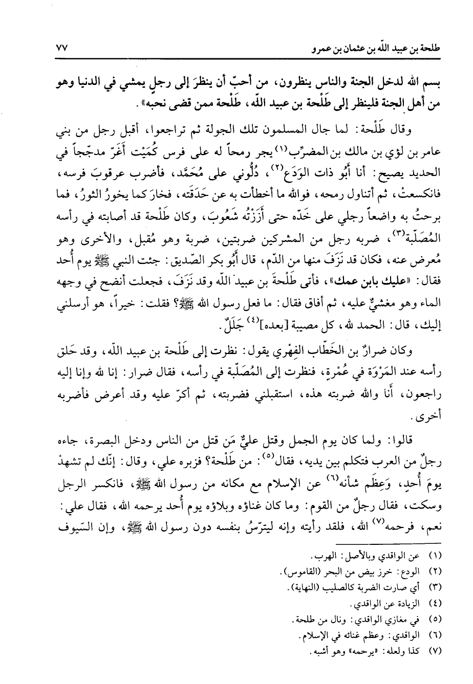 بسم الله لدخل الجنة والناس ينظرون من أحب أن ينظر إلى رجل يمشي في الدنيا وهو من أهل الجنة فلينظر إلى طلحة بن عبيد الله طلحة ممن قضى نحبه وقال طلحة لما جال المسلمون تلك الجولة ثم تراجعوا أقبل رجل من بني عامر بن لؤي بن مالك بن المضرب (1) يجر رمحا له على فرس كميت أغر مدججا في الحديد يصيح أنا أبو ذات الودع (2) دلوني على محمد فأضرب عرقوب فرسه فانكسعت ثم أتناول رمحه فوالله ما أخطأت به عن حدقته فخاركما يخور الثور فما برحت به واضعا رجلي على خده حتى أززته شعوب وكان طلحة قد أصابته في رأسه المصلبة (3) ضربه رجل من المشركين ضربتين ضربة وهو مقبل والأخرى وهو معرض عنه فكان قد نزف منها من الدم قال أبو بكر الصديق جئت النبي (صلى الله عليه وسلم) يوم أحد فقال عليك بابن عمك فأتى طلحة بن عبيد الله وقد نزف فجعلت أنضح في وجهه الماء وهو مغشي عليه ثم أفاق فقال ما فعل رسول الله (صلى الله عليه وسلم) فقلت خيرا هو أرسلني إليك قال الحمد لله كل مصيبة بعده (4) جلل وكان ضرار بن الخطاب الفهري يقول نظرت إلى طلحة بن عبيد الله وقد حلق رأسه عند المروة في عمرة فنظرت إلى المصلبة في رأسه فقال ضرار إنا لله وإنا إليه راجعون أنا والله ضربته هذه استقبلني فضربته ثم أكر عليه وقد أعرض فاضربه أخرى قالوا ولما كان يوم الجمل وقتل علي من قتل من الناس ودخل البصرة جاءه رجل من العرب فتكلم بين يديه فقال (5) من طلحة فزبره علي وقال إنك لم تشهد يوم أحد وعظم شأنه (6) عن الإسلام مع مكانه من رسول الله (صلى الله عليه وسلم) فانكسر الرجل وسكت فقال رجل من القوم وما كان غناؤه وبلاؤه يوم أحد يرحمه الله فقال علي نعم فرحمه (7) الله فلقد رأيته وإنه ليترس بنفسه دون رسول الله (صلى الله عليه وسلم) وإن السيوف