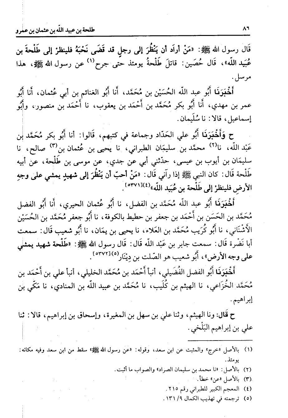 قال رسول الله (صلى الله عليه وسلم) من أراد أن ينظر إلى رجل قد قضى نحبه فلينظر إلى طلحة بن عبيد الله قال حصين قاتل طلحة يومئذ حتى جرح (1) عن رسول الله - (صلى الله عليه وسلم) هذا مرسل - أخبرنا أبو عبد الله الحسين بن محمد أنا أبو الغنائم بن أبي عثمان أنا أبو عمر بن مهدي أنا أبو بكر محمد بن أحمد بن يعقوب نا أحمد بن منصور وأبو إسماعيل قالا نا سليمان ح وأخبرنا أبو علي الحداد وجماعة في كتببم قالوا أنا أبو بكر محمد بن عبد الله نا (2) محمد بن سليمان الطبراني نا يحيى بن عثمان بن (3) صالح نا سليمان بن أيوب بن عيسى حدثني أبي عن جدي عن موسى بن طلحة عن أبيه طلحة قال كان النبي (صلى الله عليه وسلم) إذا رآني قال من أحب أن ينظر إلى شهيد يمشي على وجه الأرض فلينظر إلى طلحة بن عبيد الله أخبرنا أبو عبد الله محمد بن الفضل نا أبو عثمان الحيري أنا أبو الفضل محمد أبن الحسن بن أحمد بن جعفر بن حطيط بالكوفة نا أبو جعفر محمد بن الحسين الأشناني نا أبو كريب محمد بن العلاء نا يحيى بن يمان نا أبو شعيب قال سمعت أبا نضرة قال سمعت جابر بن عبد الله قال قال رسول الله (صلى الله عليه وسلم) طلحة شهيد يمشي على وجه الأرض أبو شعيب هو الصلت بن دينار أخبرنا أبو الفضل الفضيلي أنبأ أحمد بن محمد الخليلي أنبأ علي بن أحمد بن محمد الخزاعي نا الهيثم بن كليب نا محمد بن عبيد الله بن المنادي نا مكي بن إبراهيم ح قال ونا الهيثم وثنا علي بن سهل بن المغيرة وإسحاق بن إبراهيم قالا ثنا علي بن إبراهيم البلخي