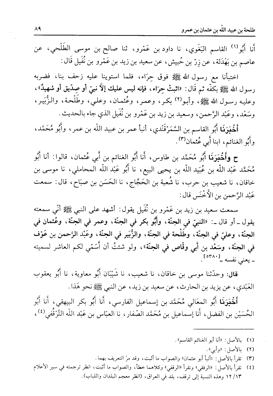 أنا أبو القاسم البغوي نا داود بن عمرو ثنا صالح بن موسى الطلحي عن عاصم بن بهدلة عن زر بن حبيش عن سعيد بن زيد بن عمرو بن نفيل قال اختبأنا مع رسول الله (صلى الله عليه وسلم) فوق حراء فلما استوينا عليه زحف بنا فضربه رسول الله (صلى الله عليه وسلم) بكفه ثم قال اثبت حراء فإنه ليس عليك إلا نبي أو صديق أو شهيد وعليه رسول الله (صلى الله عليه وسلم) وأبو (2) بكر وعمر وعثمان وعلي وطلحة والزبير وسعد وعبد الرحمن وسعيد بن زيد بن عمرو بن نفيل الذي جاء بالحديث أخبرنا أبو القاسم بن السمرقندي أنبأ عمر بن عبيد الله بن عمر وأبو محمد وأبو الغنائم ابنا أبي عثمان (3) ح وأخبرنا أبو محمد بن طاوس أنا أبو الغنائم بن أبي عثمان قالوا أنا أبو محمد عبد الله بن عبيد الله بن يحيى البيع نا أبو عبد الله المحاملي نا موسى بن خاقان نا شعيب بن حرب نا شعبة بن الحجاج نا الحسن بن صباح قال سمعت عبد الرحمن بن الأخنس قال سمعت سعيد بن زيد بن عمرو بن نفيل يقول أشهد على النبي (صلى الله عليه وسلم) أني سمعته يقول أو قال النبي في الجنة وأبو بكر في الجنة وعمر في الجنة وعثمان في الجنة وعلي في الجنة وطلحة في الجنة والزبير في ال 4 جنة وعبد الرحمن بن عوف في الجنة وسعد بن أبي وقاص في الجنة ولو شئت أن أسمي لكم العاشر لسميته يعني نفسه قال وحدثنا موسى بن خاقان نا شعيب نا شيبان أبو معاوية نا أبو يعقوب العبدي عن يزيد بن الحارث عن سعيد بن زيد عن النبي (صلى الله عليه وسلم) نحو هذا أخبرنا أبو المعالي محمد بن إسماعيل الفارسي أنا أبو بكر البيهقي أنا أبو الحسين بن الفضل أنا إسماعيل بن محمد الصفار نا العباس بن عبد الله الترقفي (4)