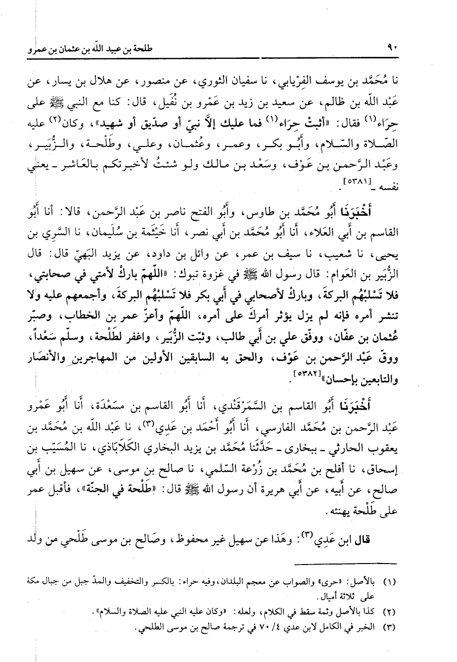 نا محمد بن يوسف الفريابي نا سفيان الثوري عن منصور عن هلال بن يسار عن عبد الله بن ظالم عن سعيد بن زيد بن عمرو بن نفيل قال كنا مع النبي (صلى الله عليه وسلم) على حراء (1) فقال أثبت حراء (1) فما عليك إلا نبي أو صديق أو شهيد وكان (2) عليه الصلاة والسلام وأبو بكر وعمر وعثمان وعلي وطلحة والزبير وعبد الرحمن بن عوف وسعد بن مالك ولو شئت لأخبرتكم بالعاشر يعني نفسه أخبرنا أبو محمد بن طاوس وأبو الفتح ناصر بن عبد الرحمن قالا أنا أبو القاسم بن أبي العلاء أنا أبو محمد بن أبي نصر أنا خيثمة بن سليمان نا السري بن يحيى نا شعيب نا سيف بن عمر عن وائل بن داود عن يزيد البهي قال قال الزبير بن العوام قال رسول الله (صلى الله عليه وسلم) في غزوة تبوك اللهم بارك لأمتي في صحابتي فلا تسلبهم البركة وبارك لأصحابي في أبي بكر فلا تسلبهم البركة وأجمعهم عليه ولا تنشر أمره فإنه لم يزل يؤثر أمرك على أمره اللهم وأعز عمر بن الخطاب وصبر عثمان بن عفان ووفق علي بن أبي طالب وثبت الزبير واغفر لطلحة وسلم سعدا ووق عبد الرحمن بن عوف والحق به السابقين الأولين من المهاجرين والأنصار والتابعين بإحسان أخبرنا أبو القاسم بن السمرقندي أنا أبو القاسم بن مسعدة أنا أبو عمرو عبد الرحمن بن محمد الفارسي أنا أبو أحمد بن عدي (3) نا عبد الله بن محمد بن يعقوب الحارثي ببخارى حدثنا محمد بن يزيد البخاري الكلاباذي نا المسيب بن إسحاق نا أفلح بن محمد بن زرعة السلمي نا صالح بن موسى عن سهيل بن أبي صالح عن ابيه عن ابي هريرة أن رسول الله (صلى الله عليه وسلم) قال طلحة في الجنة فأقبل عمر على طلحة يهنئه قال ابن عدي (3) وهذا عن سهيل غير محفوظ وصالح بن موسى طلحي من ولد