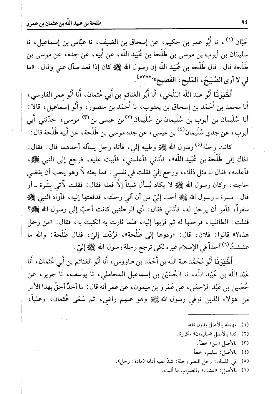 حيان (1) نا أبو عمر بن حكيم عن إسحاق بن الضيف نا عباس بن إسماعيل نا سليمان بن أيوب بن موسى بن طلحة بن عبيد الله إن رسول الله (صلى الله عليه وسلم) كان إذا قعد سأل عني وقال ما لي لا أرى الصبيح المليح الفصيح أخبرنا أبو عبد الله البلخي أنا أبو الغنائم بن أبي عثمان أنا أبو عمر الفارسي أنا محمد بن أحمد بن إسحاق بن يعقوب نا أحمد بن منصور وأبو إسماعيل قالا أنا سليمان بن أيوب بن سليمان (2) بن سليمان بن (3) عيسى بن موسى حدثني أبي أيوب عن جدي سليمان (4) بن عيسى عن جده موسى بن طلحة عن أبيه طلحة قال كانت رحلة (5) رسول الله (صلى الله عليه وسلم) وطيبه إلي فأتاه رجل يسأله أحدهما قال فقال ذاك إلى طلحة بن عبيد الله فأتاني فأعلمني فأبيت عليه فرجع إلى النبي (صلى الله عليه وسلم) فأعلمه فقال له مثل ذلك ورجع إلي فقلت في نفسي فما بعثه لا وهو يحب أن يقضي حاجته وكان رسول الله (صلى الله عليه وسلم) لا يكاد يسأل شيئا إلا فعله فقال فقلت لآتي بشرة أو قال مسرة رسول الله (صلى الله عليه وسلم) أحب إلي من أن ألي رحلته فدفعتها إليه فأراد النبي (صلى الله عليه وسلم) سفرا فأمر أن يرحل له فأتاني فقال أي الرحلتين كانت أحب إلى رسول الله (صلى الله عليه وسلم) فقلت الطائفية فرحلها له ثم قربها إليه فلما ثارت به انكبت به فقال من رحل هذه قالوا فلان قال ردوها إلى طلحة فردت إلي فقال طلحة والله ما غشت (6) أحدا في الإسلام غيره لكي ترجع رحلة رسول الله (صلى الله عليه وسلم) إلي أخبرنا أبو محمد هبة الله بن أحمد بن طاووس أنا أبو الغنائم بن أبي عثمان أنا عبد الله بن عبيد الله نا الحسين بن إسماعيل المحاملي نا يوسف نا جرير عن حصين بن عبد الرحمن عن عمرو بن ميمون عن عمر أنه قال ما أحد أحق بهذا الأمر من هؤلاء الذين توفي رسول الله (صلى الله عليه وسلم) وهو عنهم راض ثم سمى عثمان وعليا