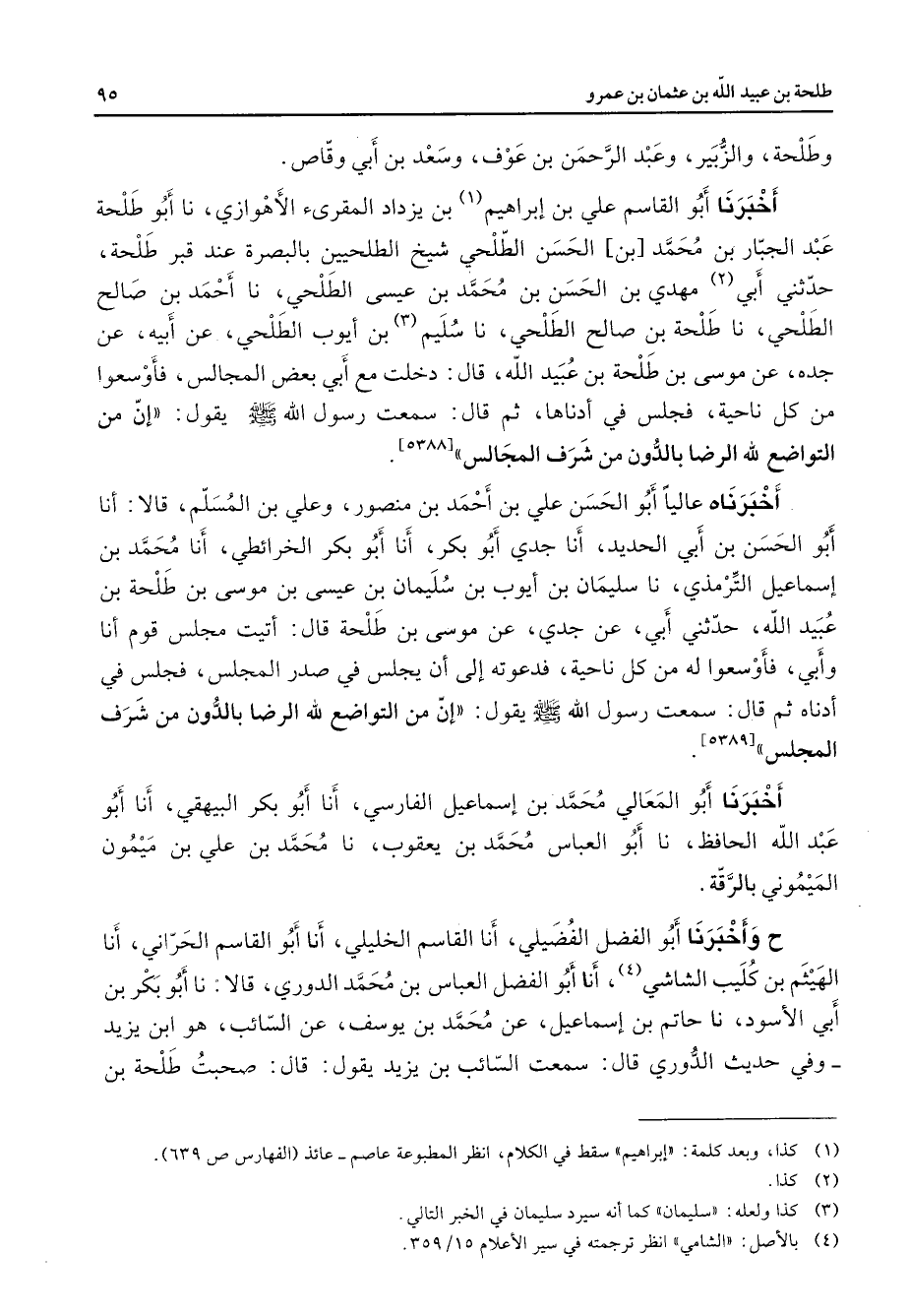 وطلحة والزبير وعبد الرحمن بن عوف وسعد بن أبي وقاص أخبرنا أبو القاسم علي بن إبراهيم (1) بن يزداد المقرئ الأهوازي نا أبو طلحة عبد الجبار بن محمد بن الحسن الطلحي شيخ الطلحيين بالبصرة عند قبر طلحة حدثني أبي (2) مهدي بن الحسن بن محمد بن عيسى الطلحي نا أحمد بن صالح الطلحي نا طلحة بن صالح الطلحي نا سليم (3) بن أيوب الطلحي عن أبيه عن جده عن موسى بن طلحة بن عبيد الله قال دخلت مع أبي بعض المجالس فأوسعوا من كل ناحية فجلس في أدناها ثم قال سمعت رسول الله (صلى الله عليه وسلم) يقول إن من التواضع لله الرضا بالدون من شرف المجالس أخبرناه عاليا أبو الحسن علي بن منصور وعلي بن المسلم قالا أنا أبو الحسن بن أبي الحديد أنا جدي أبو بكر أنا أبو بكر الخرائطي أنا محمد بن إسماعيل الترمذي نا سليمان بن أيوب بن سليمان بن عيسى بن موسى بن طلحة بن عبيد الله حدثني أبي عن جدي عن موسى بن طلحة قال أتيت مجلس قوم أنا وأبي فأوسعوا له من كل ناحية فدعوته إلى أن يجلس في صدر المجلس فجلس في أدناه ثم قال سمعت رسول الله (صلى الله عليه وسلم) يقول إن من التواضع لله الرضا بالدون من شرف المجلس أخبرنا أبو المعالي محمد بن إسماعيل الفارسي أنا أبو بكر البيهقي أنا أبو عبد الله الحافظ نا أبو العباس محمد بن يعقوب نا محمد بن علي بن ميمون الميموني بالرقة ح وأخبرنا أبو الفضل الفضيلي أنا القاسم الخليلي أنا أبو القاسم الحراني أنا الهيثم بن كليب الشاشي (4) أنا أبو الفضل العباس بن محمد الدوري قالا أنا أبو بكر بن أبي الأسود نا حاتم بن إسماعيل عن محمد بن يوسف عن السائب هو ابن يزيد وفي حديث الدوري قال سمعت السائب بن يزيد يقول قال صبحت طلحة بن