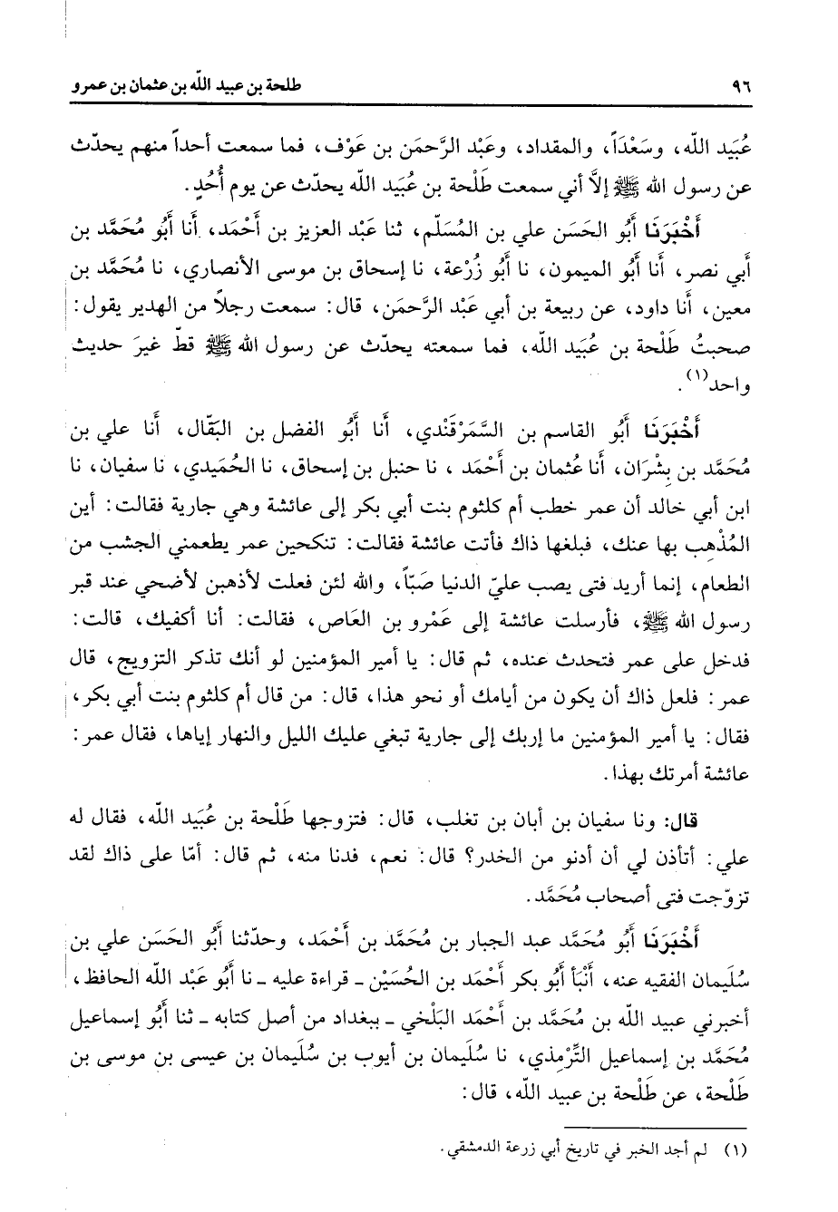 عبيد الله وسعدا والمقداد وعبد الرحمن بن عوف فما سمعت أحدا منهم يحدث عن رسول الله (صلى الله عليه وسلم) إلا أني سمعت طلحة بن عبيد الله يحدث عن يوم أحد أخبرنا أبو الحسن علي بن المسلم ثنا عبد العزيز بن أحمد أنا أبو محمد بن أبي نصر أنا أبو الميمون نا أبو زرعة نا إسحاق بن موسى الأنصاري نا محمد بن معين أنا داود عن ربيعة بن أبي عبد الرحمن قال سمعت رجلا من الهدير يقول صحبت طلحة بن عبيد الله فما سمعته يحدث عن رسول الله (صلى الله عليه وسلم) قط غير حديث واحد (1) أخبرنا أبو القاسم بن السمرقندي أنا أبو الفضل بن البقال أنا علي بن محمد بن بشران أنا عثمان بن أحمد نا حنبل بن إسحاق نا الحميدي نا سفيان نا ابن أبي خالد أن عمر خطب أم كلثوم بنت أبي بكر إلى عائشة وهي جارية فقالت أين المذهب بها عنك فبلغها ذاك فأتت عائشة فقالت تنكحين عمر يطعمني الجشب من الطعام إنما أريد فتى يصب علي الدنيا صبا والله لئن فعلت لأذهبن لأضحي عند قبر رسول الله (صلى الله عليه وسلم) فأرسلت عائشة إلى عمرو بن العاص فقالت أنا أكفيك قالت فدخل على عمر فتحدث عنده ثم قال يا أمير المؤمنين لو أنك تذكر التزويج قال عمر فلعل ذاك أن يكون من أيامك أو نحو هذا قال من قال أم كلثوم بنت أبي بكر فقال يا أمير المؤمنين ما إربك إلى جارية تبغي عليك الليل والنهار إياها فقال عمر عائشة أمرتك بهذا قال ونا سفيان بن أبان بن تغلب قال فتزوجها طلحة بن عبيد الله فقال له علي اتأذن لي أن أدنو من الخدر قال نعم فدنا منه ثم قال أنا على ذاك لقد تزوجت فتى أصحاب محمد أخبرنا أبو محمد عبد الجبار بن محمد بن أحمد وحدثنا أبو الحسن علي بن سليمان الفقيه عنه أنبأ أبو بكر أحمد بن الحسين قراءة عليه نا أبو عبد الله الحافظ أخبرني عبيد الله بن محمد بن أحمد البلخي ببغداد من أصل كتابه ثنا أبو إسماعيل محمد بن إسماعيل الترمذي نا سليمان بن أيوب بن سليمان بن عيسى بن موسى بن طلحة عن طلحة بن عبيد الله قال