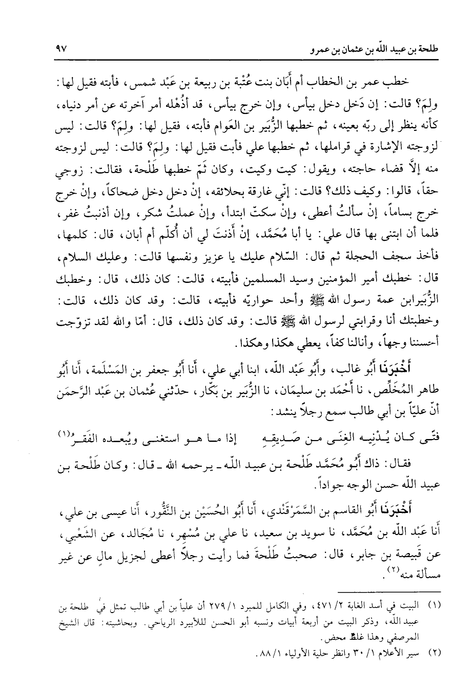 خطب عمر بن الخطاب أم أبان بنت عتبة بن ربيعة بن عبد شمسفأبت فقيل لها ولم قالت إن دخل بيأس وإن خرج بيأس قد أذهله أمر آخرته عن أمر دنياه كأنه ينظر إلى ربه بعينه ثم خطبها الزبير بن العوام فأبته فقيل لها ولم قالت ليس لزوجته الإشارة في قراملها ثم خطبها علي فأبت فقيل لها ولم قالت ليس لزوجته منه إلا قضاء حاجته ويقول كيت وكيت وكان ثم خطبها طلحة فقالت زوجي حقا قالوا وكيف ذاك قالت إني غارقة بحلائقه إن دخل دخل ضحاكا وإن خرج خرج بساما إن سألت أعطى وإن سكت ابتدأ وإن عملت شكر وإن أذنبت غفر فلما أن ابتنى بها قال علي يا أبا محمد إن أذنت لي أن أكلم أم أبان قال كلمها فأخذ سجف الحجلة ثم قال السلام عليك يا عزيز ونفسها قالت وعليك السلام قال خطبك أمير المؤمنين وسيد فأبيته قالت كان ذلك قال وخطبك الزبير ابن عمة رسول الله (صلى الله عليه وسلم) وأحد حواريه فأبيته قالت وقد كان ذلك قالت وخطبتك أنا وقرابتي لرسول الله (صلى الله عليه وسلم) قالت وقد كان ذلك قال أما والله لقد تزوجت أحسننا وجها وأنالنا كفا يعطي هكذا وهكذا أخبرنا أبو غالب وأبو عبد الله ابنا أبي علي أنا أبو جعفر بن المسلمة أنا أبو طاهر المخلص نا أحمد بن سليمان نا الزبير بن بكار حدثني عثمان بن عبد الرحمن أن عليا بن أبي طالب سمع رجلا ينشد فتى كان يدنيه الغنى من صديقه * إذا ما هو استغنى ويبعده الفقر (1) فقال ذاك أبو محمد طلحة بن عبيد الله يرحمه الله قال وكان طلحة بن عبيد الله حسن الوجه جوادا أخبرنا أبو القاسم بن السمرقندي أنا أبو الحسين بن النقور أنا عيسى بن علي أنا عبد الله بن محمد نا سويد بن سعيد نا علي بن مسهر نا مجالد عن الشعبي عن قبيصة بن جابر قال صحبت طلحة فما رأيت رجلا أعطى لجزيل مال عن غير مسألة منه (2)