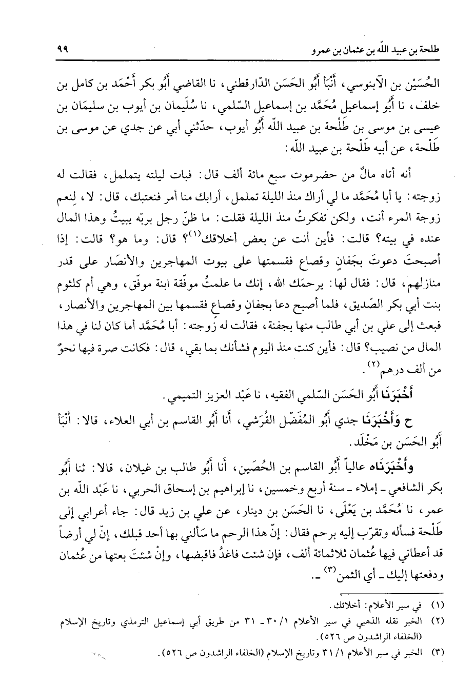 عنده في بيته قالت فأين أنت عن بعض أخلاقك (1) قال وما هو قالت إذا أصبحت دعوت بجفان وقصاع فقسمتها على بيوت المهاجرين والأنصار على قدر منازلهم قال فقال لها يرحمك الله إنك ما علمت موفقة ابنة موفق وهي أم كلثوم بنت أبي بكر الصديق فلما أصبح دعا بجفان وقصاع فقسمها بين المهاجرين والأنصار فبعث إلي علي بن أبي طالب منها بجفنة فقالت له زوجته أبا محمد أما كان لنا في هذا المال من نصيب قال فأين كنت منذ اليوم فشأنك بما بقي قال فكانت صرة فيها نحو من ألف درهم (2) أخبرناه أبو الحسن السلمي الفقيه نا عبد العزيز التميمي ح وأخبرنا جدي أبو المفضل القرشي أنا أبو القاسم بن أبي العلاء قالا أنبأ أبو الحسن بن مخلد وأخبرنا عاليا أبو القاسم بن الحصين أنا أبو طالب بن غيلان قالا ثنا أبو بكر الشافعي إملاء سنة أربع وخمسين نا إبراهيم بن إسحاق الحربي نا عبد الله بن عمر نا محمد بن يعلى نا الحسن بن دينار عن علي بن زيد قال جاء أعرابي إلى طلحة فسأله وتقرب إليه برحم فقال إن هذا الرحم ما سألني بها أحد قبلك إن لي أرضا قد أعطاني فيها عثمان ثلاثمائة ألف فإن شئت فاغد فاقبضها وإن شئت بعتها من عثمان ودفعتها إليك أي الثمن (3)