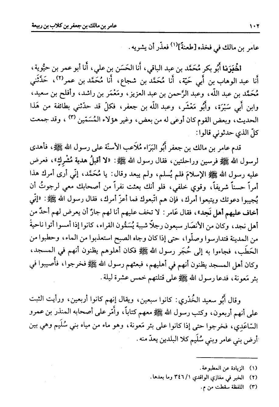 عامر بن مالك في فخذه طعنة (1) فعذر أن يشويه [] أخبرنا أبو بكر محمد بن عبد الباقي أنا الحسن بن علي أنا أبو معمر بن حيوية أنا عبد الوهاب بن أبي حية أنا محمد بن شجاع أنا محمد بن عمر (2) حدثني محمد بن عبد الله وعبد الرحمن بن عبد العزيز ومعمر بن راشد وأفلح بن سعيد وابن أبي سبرة وأبو معشر وعبد الله بن جعفر فكل قد حدثني بطائفة من هذا الحديث وبعض القوم كان أوعى له من بعض وغير هؤلاء المسمين (3) وقد جمعت كل الذي حدثوني قالوا قدم عامر بن مالك بن جعفر أبو البراء ملاعب الأسنة على رسول الله (صلى الله عليه وسلم) فأهدى لرسول الله (صلى الله عليه وسلم) فرسين وراحلتين فقال رسول الله (صلى الله عليه وسلم) لا أقبل هدية مشرك فعرض عليه رسول الله عليه الإسلام فلم يسلم ولم يبعد وقال يا محمد إني أرى أمرك هذا أمرا حسنا شريفا وقوي خلفي فلو أنك بعثت نفرا من أصحابك معي لرجوت أن يجيبوا دعوتك ويتبعوا أمرك فإن هم اتبعوك فما أعز أمرك فقال رسول الله (صلى الله عليه وسلم) إني أخاف عليهم أهل نجد فقال عامرلا تخف عليهم أنا لهم جار أن يعرض لهم أحد من أهل نجد وكان من الأنصار سبعون رجلا شببة يسمون القراء كانوا إذا أمسوا أتوا ناحية من المدينة فتدارسوا وصلوحتى إذا كان وجاه الصبح استعذبوا من الماء وحطبوا من الحطب فجاءوا به إلى حجررسول الله (صلى الله عليه وسلم) فكان أهلوهم يظنون أنهم في المسجد وكان أهل المسجد يظنون أنهم في أهليهم فبعثهم رسول الله (صلى الله عليه وسلم) فخرجوا فأصيبوا في بئر معونة فدعا رسول الله (صلى الله عليه وسلم) على قتلتهم خمس عشرة ليلة [] وقال أبو سعيد الخدري كانوا سبعين ويقال إنهم كانوا أربعين ورأيت الثبت على أنهم أربعون وكتب رسول الله (صلى الله عليه وسلم) معهم كتابا وأمر على أصحابه المنذر بن عمرو الساعدي فخرجوا حتى إذا كانوا على بئر معونة وهو ماء من مياه بني سليم وهي بين أرض بني عامر وبني سليم كلا البلدين يعد منه