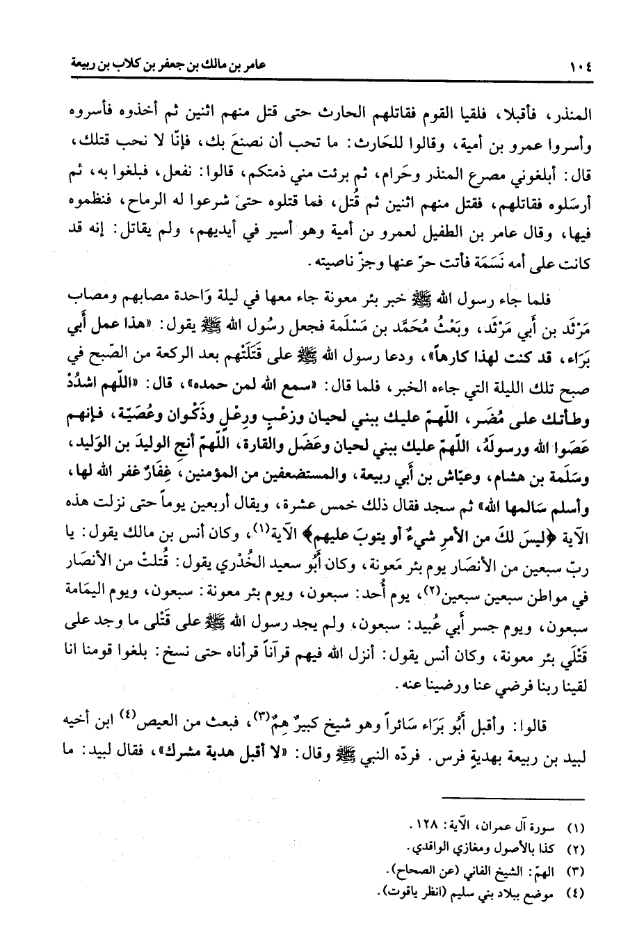 المنذر فأقبلا فلقيا القوم فقاتلهم الحارث حتى قتل منهم اثنين ثم أخذوه فأسروه وأسروا عمرو بن أمية وقالوا للحارث ما تحب أن نصنع بك فأنا لا نحب قتلك قال أبلغوني مصرع المنذر وحرام ثم برئت مني ذمتكم قالوا نفعل فبلغوا به ثم أرسلوه فقاتلهم فقتل منهم اثنين ثم قتل فما قتلوه حتى شرعوا لهالرماح فنظموه فيها وقال عامر بن الطفيل لعمرو بن أمية وهو أسير في أيديهم ولم يقاتل إنه قد كانت على أمه نسمة فأتت حر عنها وجز ناصيته فلما جاء رسول الله (صلى الله عليه وسلم) خبر بئر معونة جاء معها في ليلة واحدة مصابه ومصاب مرثدبن أبي مرثد وبعث محمد بن مسلمة فجعل رسول الله (صلى الله عليه وسلم) يقول هذا عمل أبي براء قد كنت لهذا كارها ودعا رسول الله (صلى الله عليه وسلم) على قتلتهم بعد الركعة من الصبح في صبح تلك الليلة التي جاءه الخبر فلما قال سمع الله لمن حمده قال اللهم اشدد وطأتك على مضر اللهم عليك ببني لحيان وزعب ورعل وذكوان وعصية فإنهم عصوا الله ورسوله اللهم عليك ببني لحياوعضل والقارة اللهم أنج الوليد بن الوليد وسلمة بن هشام وعياش بن أبي ربيعة والمستضعفين من المؤمنين غفار غفر الله لها وأسلم سالمها الله ثسجد فقال ذلك خمس عشرة ويقال أربعين يوما حتى نزلت هذه الآية " ليس لك من الأمر شئ أو يتوب عليهم " الآية (1) وكان أنس بن مالك يقول يا رب سبعين من الأنصار يوم بئر معونة وكان أبو سعيد الخدري يقول قتلت من الأنصار في مواطن سبعين سبعين (2) يوم أحد سبعون ويوم بئر معونة سبعون ويوم اليمامة سبعون ويوم جسرأبي عبيد سبعون ولم يجد رسول الله (صلى الله عليه وسلم) على قتلى ما وجد على قتلي بئر معونة وكان أنس يقول أنزل الله قرآنا قرأناه حتى نسخ بلغوا قومنا انا لقينا ربنا فرضي عنا ورضينا عنه قالوا وأقبل أبو براء سائرا وهو شيخ كبير هم (3) فبعث من العيص (4) ابن أخيه لبيد بن ربيعة بهدية فرس فرده النبي (صلى الله عليه وسلم) وقال لا أقبل هدية مشرك فقال لبيد ما