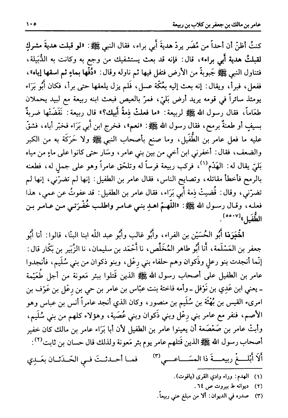 [5507] أخبرنا أبو الحسين بن الفراء وأبو غالب وأبو عبد الله ابنا البنا قالوا أنا أبو جعفر بن المسلمة أنا أبطاهر المخلص نا أحمد بن سليمان نا الزبير بن بكار قال إنما أنجدت بنو رعل وذكوان وهم حلفاء بني رعل وبنو ذكوان من بني سليم فأنجدوا عامر بن الطفيل على أصحاب رسول الله (صلى الله عليه وسلم) الذين قتلوا ببئر معونة من أجل طعيمة يعني ابن عدي بن نوفل وأمه فاخته بنت عباس بن عامر بن حي بن رعل بن عوف بن امرئ القيس بن بهثة بن سليم بن منصور وكان الذي أنجد عامرا أنس بن عباس وهو الأصم فنفر مع عامر بني رعل وبني ذكوان وبني عصية وهؤلاء كلهم من بني سليم وأبت عامر بن صعصعة أن يعينوا عامر بن الطفيل لأن أبا براء عامر بن مالك كان خفير أصحاب رسول الله (صلى الله عليه وسلم) الذين قتلهم عامر يوم بئر معونة وذلك قال حسان بن ثابت (2) * ألا أبلغ ربيعة ذا المساعي (3) * فما أحدثت في الحدثان بعدي