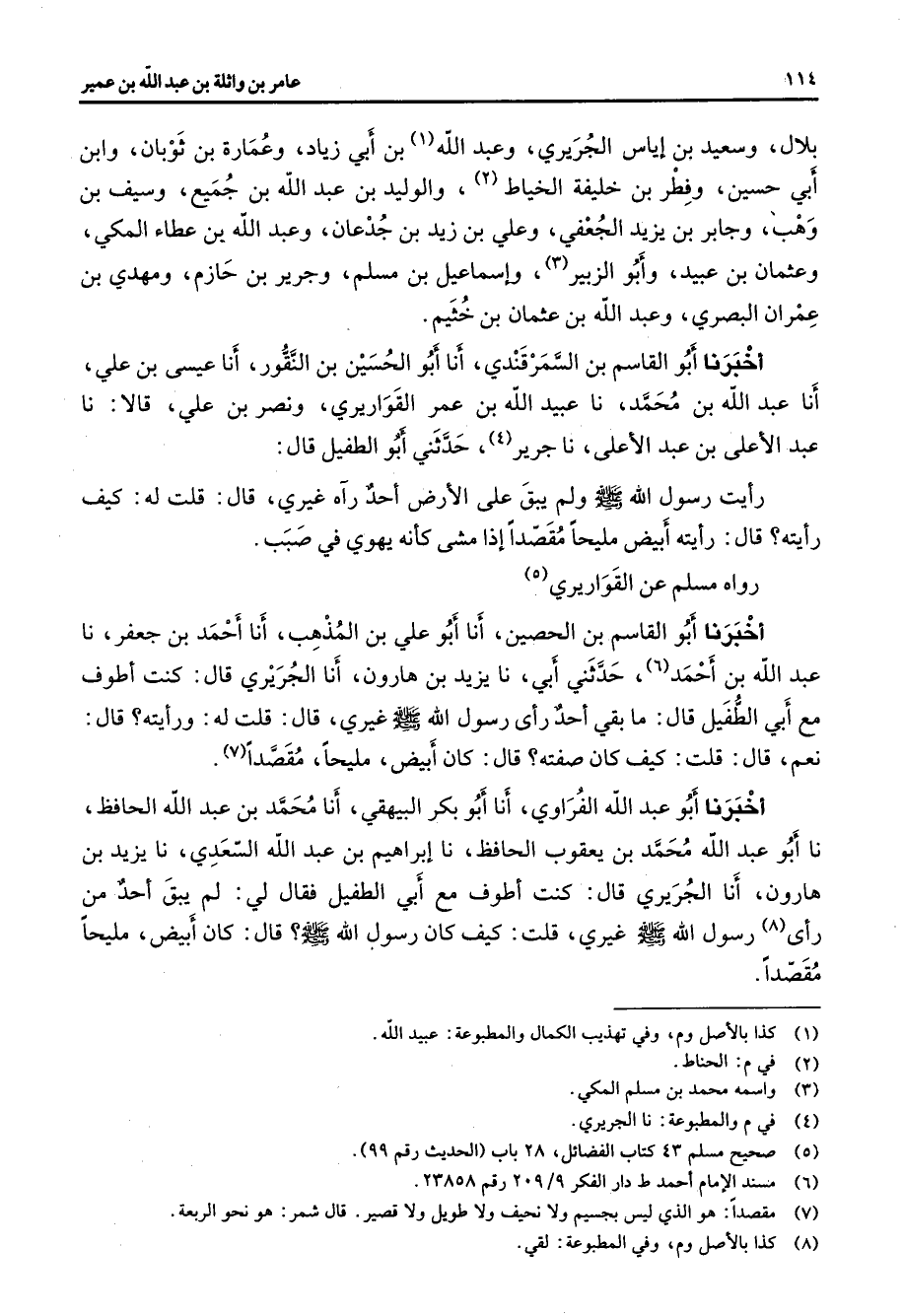 بلال وسعيد بن إياس الجريري وعبد الله (1) بن أبي زياد وعمارة بن ثوبان وابن أبي حسين وفطر بن خليفة الخياط (2) والوليد بن عبد الله بن جميع وسيف بن وهب وجابر بن يزيد الجعفي وعلي بن زيد بن جدعان وعبد الله بن عطاء المكي وعثمان بن عبيد وأبو الزبير (3) وإسماعيل بن مسلم وجرير بن حازم ومهدي بن عمران البصري وعبد الله بن عثمان بن خثيم أخبرنا أبو القاسم بن السمرقندي أنا أبو الحسين بن النقور أنا عيسى بن علي أنا عبد الله بن محمد نا عبيد الله بن عمر القواريري ونصر بن علي قالا نا عبد الأعلى بن عبد الأعلى نا جرير (4) حدثني أبو الطفيل قال رأيت رسول الله (صلى الله عليه وسلم) ولم يبق على الأرض أحد رآه غيري قال قلت له كيف رأيته قال رأيته أبيض مليحا مقصدا إذا مشى كأنه يهوي في صبب رواه مسلم عن القواريري (5) أخبرنا أبو القاسم بن الحصين أنا أبو علي بن المذهب أنا أحمد بن جعفر نا عبد الله بن أحمد (6) حدثني أبي نا يزيد بن هارون أنا الجريري قال كنت أطوف مع أبي الطفيل قال ما بقي أحد رأى رسول الله (صلى الله عليه وسلم) غيري قال قلت له ورأيته قال نعم قال قلت كيف كان صفته قال كان أبيض مليحا مقصدا أخبرنا أبو عبد الله الفراوي أنا أبو بكر البيهقي أنا محمد بن عبد الله الحافظ نا أبو عبد الله محمد بن يعقوب الحافظ نا أبراهيم بن عبد الله السعدي نا يزيد بن هارون أنا الجريري قال كنت أطوف مع أبي الطفيل فقال لي لم يبق أحد من رأى (8) رسول الله (صلى الله عليه وسلم) غيري قلت كيف كان رسول الله (صلى الله عليه وسلم) قال كان أبيض مليحا مقصدا