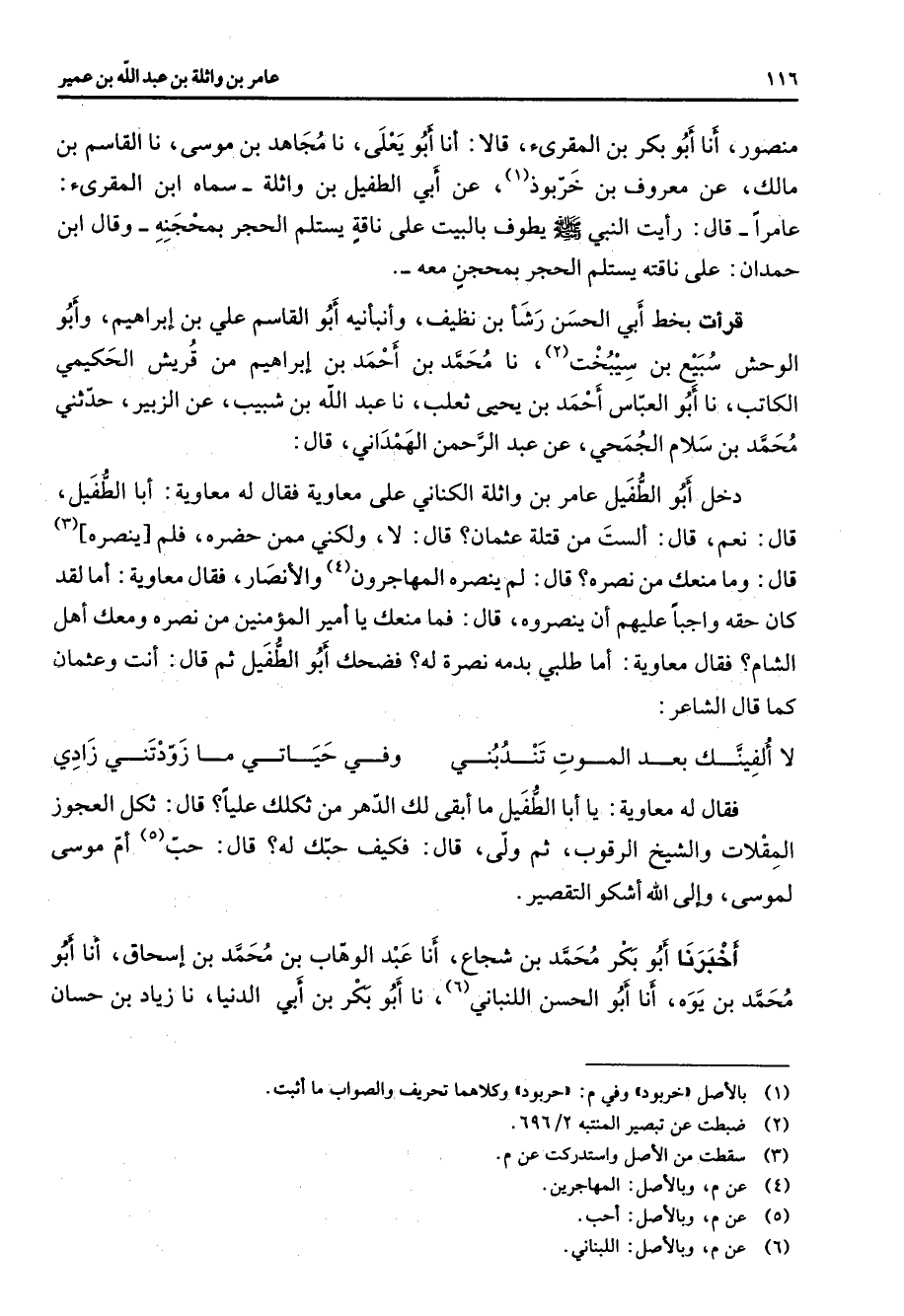 منصور أنا أبو بكر بن المقرئ قالا أنا أبو يعلى نا مجاهد بن موسى نا القاسم بن مالك عن معروف بن خربوذ (1) عن أبي الطفيل بن واثلة سماه ابن المقرئ عامرا قال رأيت النبي (صلى الله عليه وسلم) يطوف بالبيت على ناقة يستلم الحجر بمحجنه وقال ابن حمدان على ناقته يستلم الحجر بمحجن معه قرأت بخط أبي الحسن رشأ بن نظيف وأنبأنيه أبو القاسم علي بن إبراهيم وأبو الوحش سبيع بن سيبخت (2) نا محمد بن أحمد بن إبراهيم من قريش الحكيمي الكاتب نا أبو العباس أحمد بن يحيى ثعلب نا عبد الله بن شبيب عن الزبير حدثني محمد بن سلام الجمحي عن عبد الرحمن الهمداني قال دخل أبو الطفيل عامر بن واثلة الكناني على معاوية فقال له معاوية أبا الطفيل قال نعم قال ألست من قتلة عثمان قال لا ولكني ممن حضره فلم ينصره (3) قال وما منعك من نصره قال لم ينصره المهاجرون (4) والأنصار فقال معاوية أما لقد كان حقه واجبا عليهم أن ينصروه قال فما منعك يا أمير المؤمنين من نصره ومعك أهل الشام فقال معاوية أما طلبي بدمه نصرة له فضحك أبو الطفيل ثم قال أنت وعثمان كما قال الشاعر * لا الفينك بعد الموت تندبني * وفي حيات ما زودتني زادي * فقال له معاوية يا أبا الطفيل ما أبقى لك الدهر من ثكلك عليا قال ثكل العجوز المقلات والشيخ الرقوب ثم ولى قال فكيف حبك له قال حب (5) أم موسى لموسى وإلى الله أشكو التقصير أخبرنا أبو بكر محمد بن شجاع أنا عبد الوهاب بن محمد بن إسحاق أنا أبو محمد بن يوه أنا أبو الحسن اللنباني (6) نا أبو بكر بن أبي الدنيا نا زياد بن حسان