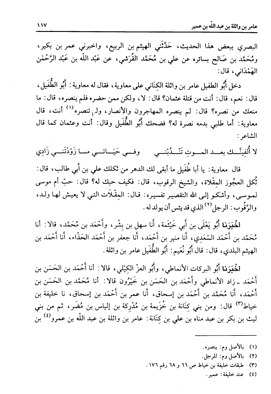 البصري ببعض هذا الحديث حدثني الهيثم بن الربيع واخبرني عمر بن بكير ومحمد بن صالح بسائره عن علي بن محمد القرشي عن عبد الله بن عبد الرحمن الهمداني قال دخل أبو الطفيل عامر بن واثلة الكناني على معاوية فقال له معاوية أبو الطفيل قال نعم قال أنت من قتلة عثمان قال لا ولكن ممن حضره فلم ينصره قال ما منعك من نصره قال لم ينصره المهاجرون والأنصار ولم تنصره (1) أنت قال معاوية أماطلبي بدمه نصرة له فضحك أبو الطفيل وقال أنت وعثمان كما قال الشاعر * لا ألفينك بعد الموت تندبني * وفي حياتي ما زودتني زادي * قال معاوية يا أبا طفيل ما أبقى لك الدهر من ثكلك علي بن أبي طالب قال ثكل العجوز المقلاة والشيخ الرقوب قال فكيف حبك له قال حب أم موسى لموسى وأشكو إلى الله التقصير تفسيره قال المقلات التي لا يعيش لها ولد والرقوب الرجل (2) الذي قد يئس أن يولد له أخبرنا أبو يعلى بن أبي خيثمة أنا سهل بن بشر وأحمد بن محمد قالا أنا محمد بن أحمد السعدي أنا منير بن أحمد أنا جعفر بن أحمد الحذاء أنا أحمد بن الهيثم البلدي قال قال أبو نعيم أبو الطفيل عامر بن واثلة أخبرنا أبو البركات الأنماطي وأبو العز الكيلي قالا أنا أحمد بن الحسن بن أحمد زاد الأنماطي وأحمد بن الحسن بن خيرون قالا أنا محمد بن الحسن بن أحمد أنا محمد بن أحمد بن إسحاق أنا عمر بن أحمد بن إسحاق نا خليفة بن خياط (3) قال ومن بني كنانة بن خزيمة بن مدركة بن إلياس بن مضر ثم من بني ليث بن بكر بن عبد مناه بن علي بن كنانة عامر بن واثلة بن عبد الله بن عمرو (4) بن