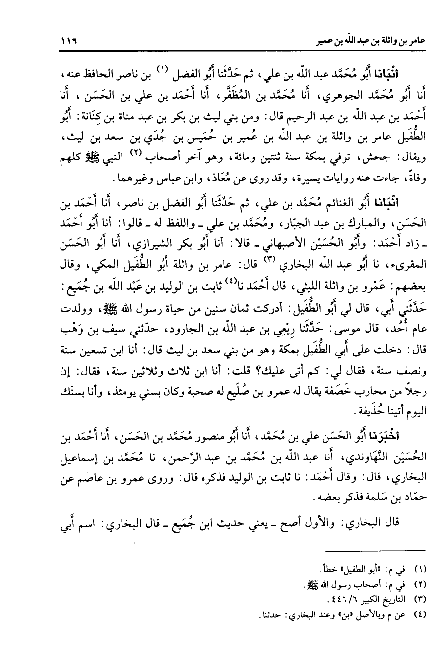 أنبأنا أبو محمد بن عبد الله بن علي ثم حدثنا أبو الفضل (1) بن ناصر الحافظ عنه أنا أبو محمد الجوهري أنا محمد بن المظفر أنا أحمد بن علي بن الحسن أنا أحمد بن عبد الله بن عبد الرحيم قال ومن بني ليث بن بكر بن عبد مناة بن كنانة أبو الطفيل عامر بن واثلة بن عبد الله بن عمير بن حميس بن جدي بن سعد بن ليث ويقال جحش توفي بمكة سنة ثنتين ومائة وهو آخر أصحاب (2) النبي (صلى الله عليه وسلم) كلهم وفاة جاءت عنه روايات يسيرة وقد روى عن معاذ وابن عباس وغيرهما أنبأنا أبو الغنائم محمد بن علي ثم حدثنا أبو الفضل بن ناصر أنا أحمد بن الحسن والمبارك بن عبد الجبار ومحمد بن علي واللفظ له قالوا أنا أبو أحمد زاد أحمد وأبو الحسين الأصبهاني قالا أنا أبو بكر الشيرازي أنا أبو الحسن المقرئ نا أبو عبد الله البخاري (3) قال عامر بن واثلة أبو الطفيل المكي وقال بعضهم عمرو بن واثلة الليثي قال أحمد نا (4) ثابت بن الوليد بن عبد الله بن جميع حدثني أبي قال لي أبو الطفيل أدركت ثمان سنين من حياة رسول الله (صلى الله عليه وسلم) وولدت عام أحد قال موسى حدثنا ربعي بن عبد الله بن الجارود حدثني سيف بن وهب قال دخلت على أبي الطفيل بمكة وهو من بني سعد بن ليث قال أنا ابن تسعين سنة ونصف سنة فقال لي كم أتى عليك قلت أنا ابن ثلاث وثلاثين سنة فقال إن رجلا من محارب خصفة يقال له عمرو بن صليع له صحبة وكان بسني يومئذ وأنا بسنك اليوم أتينا حذيفة أخبرنا أبو الحسن علي بن محمد أنا أبو منصور محمد بن الحسن أنا أحمد بن الحسين النهاوندي أنا عبد الله بن محمد بن عبد الرحمن نا محمد بن إسماعيل البخاري قال وقال أحمد نا ثابت بن الوليد فذكره قال وروى عمرو بن عاصم عن حماد بن سلمة فذكر بعضه قال البخاري والأول أصح يعني حديث ابن جميع قال البخاري اسم أبي