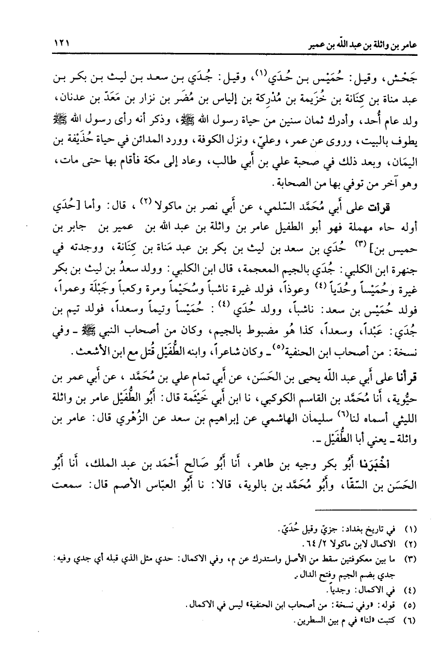 جحش وقيل حميس بن حدي (1) وقيل جدي بن سعد بن ليث بن بكر بن عبد مناة بن كنانة بن خزيمة بن مدركة بن إلياس بن مضر بن نزار بن معد بن عدنان ولد عام أحد وأدرك ثمان سنين من حياة رسول الله (صلى الله عليه وسلم) وذكر أنه رأى رسول الله (صلى الله عليه وسلم) يطوف بالبيت وروى عن عمر وعلي ونزل الكوفة وورد المدائن في حياة حذيفة بن اليمان وبعد ذلك في صحبة علي بن أبي طالب وعاد إلى مكة فأقام بها حتى مات وهو آخر من توفي بها من الصحابة قرأت على أبي محمد السلمي عن أبي نصر بن ماكولا (2) قال وأما حدي أوله حاء مهملة فهو أبو الطفيل عامر بن واثلة بن عبد الله بن عمير بن جابر بن حميس بن (3) حدي بن سعد بن ليث بن بكر بن عبد مناة بن كنانة ووجدته في جنهرة ابن الكلبي جدي بالجيم المعجمة قال ابن الكلبي وولد سعد بن ليث بن بكر غيرة وحميسا وحديا (4) وعوذا فولد غيرة ناشبا وسحيما ومرة وكعبا وجبلة وعمرا فولد حميس بن سعد ناشبا وولد حدي (4) حميسا وتيما وسعدا فولد تيم بن جدي عبدا وسعدا كذا هو مضبوط بالجيم وكان من أصحاب النبي (صلى الله عليه وسلم) وفي نسخة من أصحاب ابن الحنفية (5) وكان شاعرا وابنه الطفيل قتل مع ابن الأشعث قرأنا على أبي عبد الله يحيى بن الحسن عن أبي تمام علي بن محمد عن أبي عمر بن حيوية أنا محمد بن القاسم الكوكبي نا ابن أبي خيثمة قال أبو الطفيل عامر بن واثلة الليثي أسماه لنا (6) سليمان الهاشمي عن إبراهيم بن سعد عن الزهري قال عامر بن واثلة يعني أبا الطفيل أخبرنا أبو بكر وجيه بن طاهر أنا أبو صالح أحمد بن عبد الملك أنا أبو الحسن بن السقا وأبو محمد بن بالوية قالا نا أبو العباس الأصم قال سمعت