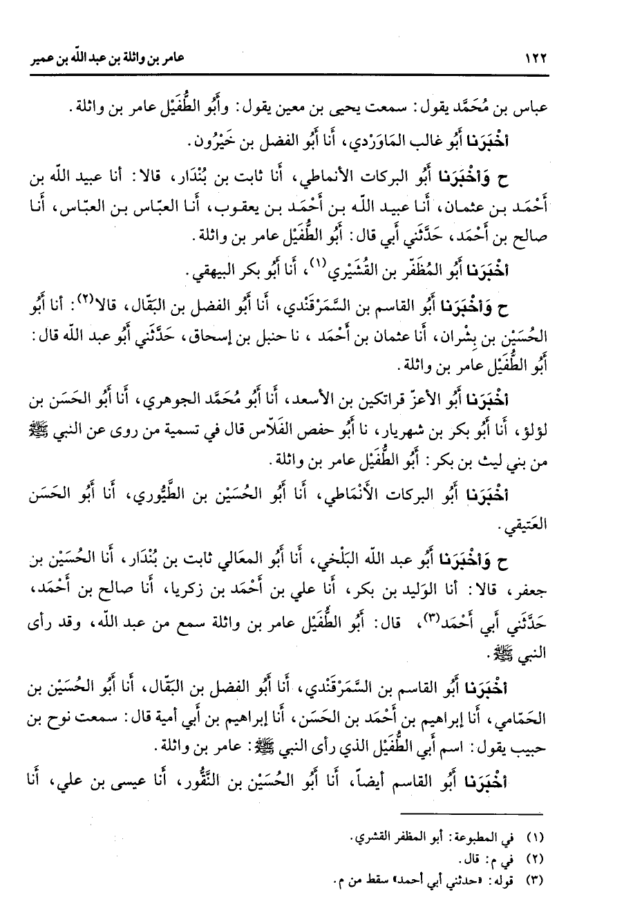 عباس بن محمد يقول سمعت يحيى بن معين يقول وأبو الطفيل عامر بن واثلة أخبرنا أبو غالب الماوردي أنا أبو الفضل بن خيرون ح وأخبرنا أبو البركات الأنماطي أنا ثابت بن بندار قالا أنا عبيد الله بن أحمد بن عثمان أنا عبيد الله بن أحمد بن يعقوب أنا العباس بن العباس أنا صالح بن أحمد حدثني أبي قال أبو الطفيل عامر بن واثلة أخبرنا أبو المظفر بن القشيري (1) أنا أبو بكر البيهقي ح وأخبرنا أبو القاسم بن السمرقندي أنا أبو الفضل بن البقال قالا (2) أنا أبو الحسين بن بشران أنا عثمان بن أحمد نا حنبل بن إسحاق حدثني أبو عبد الله قال أبو الطفيل عامر بن واثلة أخبرنا أبو الأعز قراتكين بن الأسعد أنا أبو محمد الجوهري أنا أبو الحسن بن لؤلؤ أنا أبو بكر بن شهريار نا أبو حفص الفلاس قال في تسمية من روى عن النبي (صلى الله عليه وسلم) من بني ليث بن بكر أبو الطفيل عامر بن واثلة أخبرنا أبو البركات الأنماطي أنا أبو الحسين بن الطيوري أنا أبو الحسن العتيقي ح وأخبرنا أبو عبد الله البلخي أنا أبو المعالي ثابت بن بندار أنا الحسين بن جعفر قالا أنا الوليد بن بكر أنا علي بن أحمد بن زكريا أنا صالح بن أحمد حدثني أبي أحمد (3) قال أبو الطفيل عامر بن واثلة سمع من عبد الله وقد رأى النبي (صلى الله عليه وسلم) أخبرنا أبو القاسم بن السمرقندي أنا أبو الفضل بن البقال أنا أبو الحسين بن الحمامي أنا إبراهيم بن أحمد بن الحسن أنا إبراهيم بن أبي إمية قال سمعت نوح بن حبيب يقول اسم أبي الطفيل الذي رأى النبي (صلى الله عليه وسلم) عامر بن واثلة أخبرنا أبو القاسم أيضا أنا أبو الحسين بن النقور أنا عيسى بن علي أنا