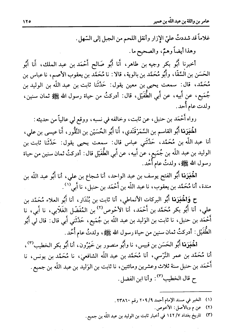 غلاما قد شددت علي الإزار وأنقل اللحم من الجبل إلى السهل وهذا أيضا وهم والصحيح ما أخبرنا أبو بكر وجيه بن طاهر أنا أبو صالح أحمد بن عبد الملك أنا أبو الحسن بن السقا وأبو محمد بن بالوية قالا نا محمد بن يعقوب الأصم نا عباس بن محمد قال سمعت يحيى بن معين يقول حدثنا ثابت بن عبد الله بن الوليد بن جميع عن أبيه عن أبي الطفيل قال أدركت من حياة رسول الله (صلى الله عليه وسلم) ثمان سنين ولدت عام أحد رواه أحمد بن حنبل عن ثابت وخالفه في نسبه ووقع لي عاليا من حديثه أخبرنا أبو القاسم بن السمرقندي أنا أبو الحسين بن النقور أنا عيسى بن علي أنا عبد الله بن محمد حدثني عباس قال سمعت يحيى يقول حدثنا ثابت بن الوليد بن عبد الله بن جميع عن أبيه عن أبي الطفيل قال أدركت ثمان سنين من حياة رسول الله (صلى الله عليه وسلم) ولدت عام أحد أخبرنا أبو الفتح يوسف بن عبد الواحد أنا شجاع بن علي أنا أبو عبد الله بن مندة أنا محمد بن يعقوب نا عبد الله بن أحمد بن حنبل نا أبي (1) ح وأخبرنا أبو البركات الأنماطي أنا ثابت بن بندار أنا أبو العلاء محمد بن علي أنا أبو بكر محمد بن أحمد أنا الأحوص (2) بن المفضل الغلابي نا أبي نا أحمد بن حنبل نا ثابت بن الوليد بن عبد الله بن جميع حدثني أبي قال قال لي أبو الطفيل أدركت ثمان سنين من حياة رسول الله (صلى الله عليه وسلم) ولدت عام أحد أخبرنا أبو الحسن بن قبيس نا وأبو منصور بن خيرون أنا أبو بكر الخطيب (3) أنا محمد بن عمر النرسي أنا محمد بن عبد الله الشافعي نا محمد بن يونس نا أحمد بن حنبل سنة ثلاث وعشرين ومائتين نا ثابت بن الوليد بن عبد الله بن جميع ح قال الخطيب (3) وأنا ابن الفضل
