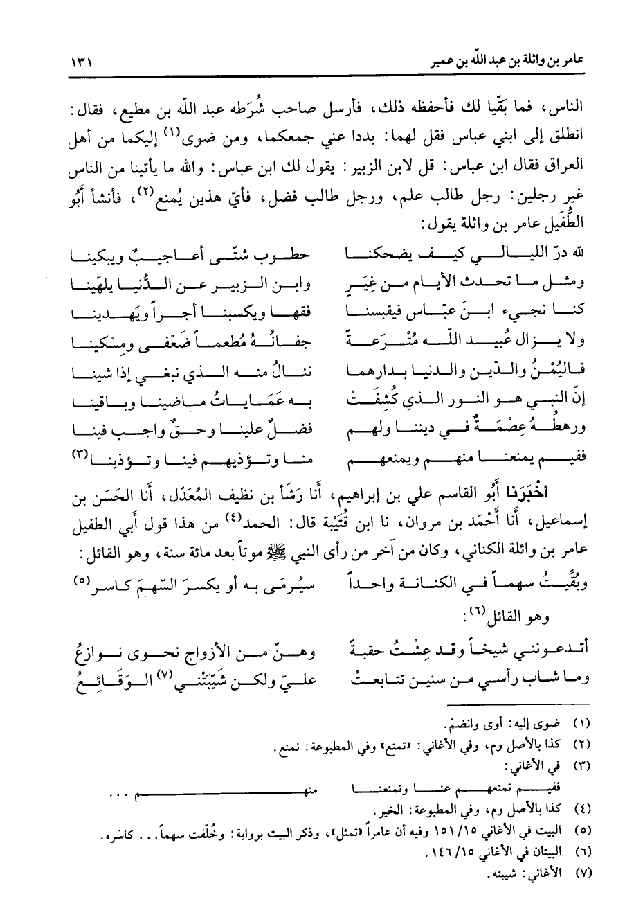 الناس فما بقيا لك فأحفظه ذلك فأرسل صاحب شرطة عبد الله بن مطيع فقال انطلق الى ابني عباس فقل لهم بددا عن جمعكما ومن ضوى (1) إليكما من أهل العراق فقال ابن عباس قل لابن الزبير يقول لك ابن عباس والله ما يأتينا من الناس غير رجلين رجل طالب علم ورجل طالب فضل فأي هذين يمنع (2) فأنشأ أبو الطفيل عامر بن واثلة يقول * لله در الليالي كيف يضحكنا * حطوب شتى أعاجيب ويبكينا ومثل ما تحدث الأيام من غير * وابن الزبير عن الدنيا يلهينا كنا نجئ ابن عباس فيقبسنا * فقها ويكسبنا أجرا ويهدينا ولا يزال عبيد الله مترعة * جفانه مطعما ضعفى ومسكينا فاليمن والدين والدنيا بدارهما * ننال منه الذي نبغي إذا شينا إن النبي هو النور الذي كشفت * به عمايات ماضينا وباقينا ورهطه عصمة في ديننا ولهم * فضل علينا وحق واجب فينا ففيم يمنعنا منهم ويمنعهم * منا وتؤذيهم فينا وتؤذينا * (3) أخبرنا أبو القاسم علي بن إبراهيم أنا رشأ بن نظيف المعدل أنا الحسن بن إسماعيل أنا أحمد بن مروان نا ابن قتيبة قال الحمد (4) من هذا قول أبي الطفيل عامر بن واثلة الكناني وكان من آخر من رأى النبي (صلى الله عليه وسلم) موتا بعد مائة سنة وهو القائل * وبقيت سهما في الكنانة واحدا * سيرمى به أو يكسر السهم كاسر * (5) وهو القائل (6) * أتدعونني شيخا وقد عشت حقبة * وهن من الأزواج نحوى نوازع وما شاب رأسي من سنين تتابعت * علي ولكن شيبتني (7) الوقائع