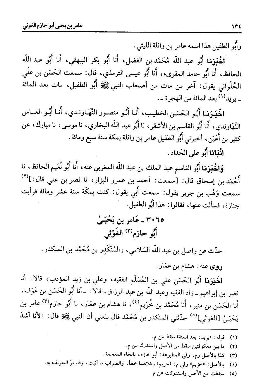 3065 - عامر بن يحيى أبو حازم (3) الغوثي حدث عن واصل بن عبد الله السلامي والمنكدر بن محمد بن المنكدر روى عنه هشام بن عمار أخبرنا أبو الحسن علي بن المسلم الفقيه وعلي بن زيد المؤدب قالا أنا نصر بن إبراهيم زاد الفقيه وعبد الله بن عبد الرزاق قالا أنا أبو الحسن بن عوف أنا الحسن بن منير أنا محمد بن خريم (4) نا هشام بن عمار نا أبو حازم (3) عامر بن يحيى الغوثي (5) حدثني المنكدر بن محمد قال بلغني أن النبي (صلى الله عليه وسلم) قال لأنا أشد