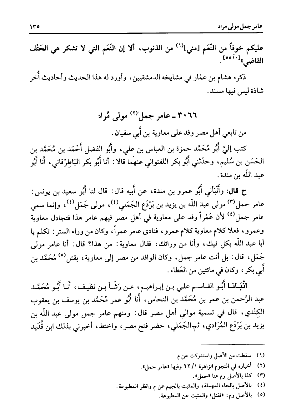 3066 - عامر جمل (2) مولى مراد من تابعي أهل مصر وفد على معاوية بن أبي سفيان كتب إلي أبو محمد حمزة بن العباس بن علي وأبو الفضل أحمد بن محمد بن الحسن بن سليم وحدثني أبو بكر اللفتواني عنهما قالا أنا أبو بكر الباطرقاني أنا أبو عبد الله بن مندة ح قال وأنبأني أبو عمرو بن مندة عن أبيه قال قال لنا أبو سعيد بن يونس عامر حمل (3) مولى عبد الله بن يزيد بن بردع الجملي (4) مولى جمل (4) وإنما سمي عامر جمل (4) لأن عمرا وفد على معاوية في أهل مصر فيهم عامر هذا فتجادل معاوية وعمرو فعلا كلام معاوية كلام عمرو فنادى عامر عمرا وكان من وراء الستر تكلم يا أبا عبد الله بكل فيك وأنا من ورائك فقال معاوية من هذا قال أنا عامر مولى جمل قال بل أنت عامر جمل وكان الوافد من مصر إلى معاوية بقتل (5) محمد بن أبي بكر وكان في مائتين من العطاء أنبأنا أبو القاسم علي بن إبراهيم عن رشأ بن نظيف أنا أبو محمد عبد الرحمن بن عمر بن محمد بن النحاس أنا أبو عمر محمد بن يوسف بن يعقوب الكندي قال في تسمية موالي أهل مصر قال ومنهم عامر جمل مولى عبد الله بن يزيد بن بردع المرادي ثم الجملي حضر فتح مصر واختط أخبرني بذلك ابن قديد