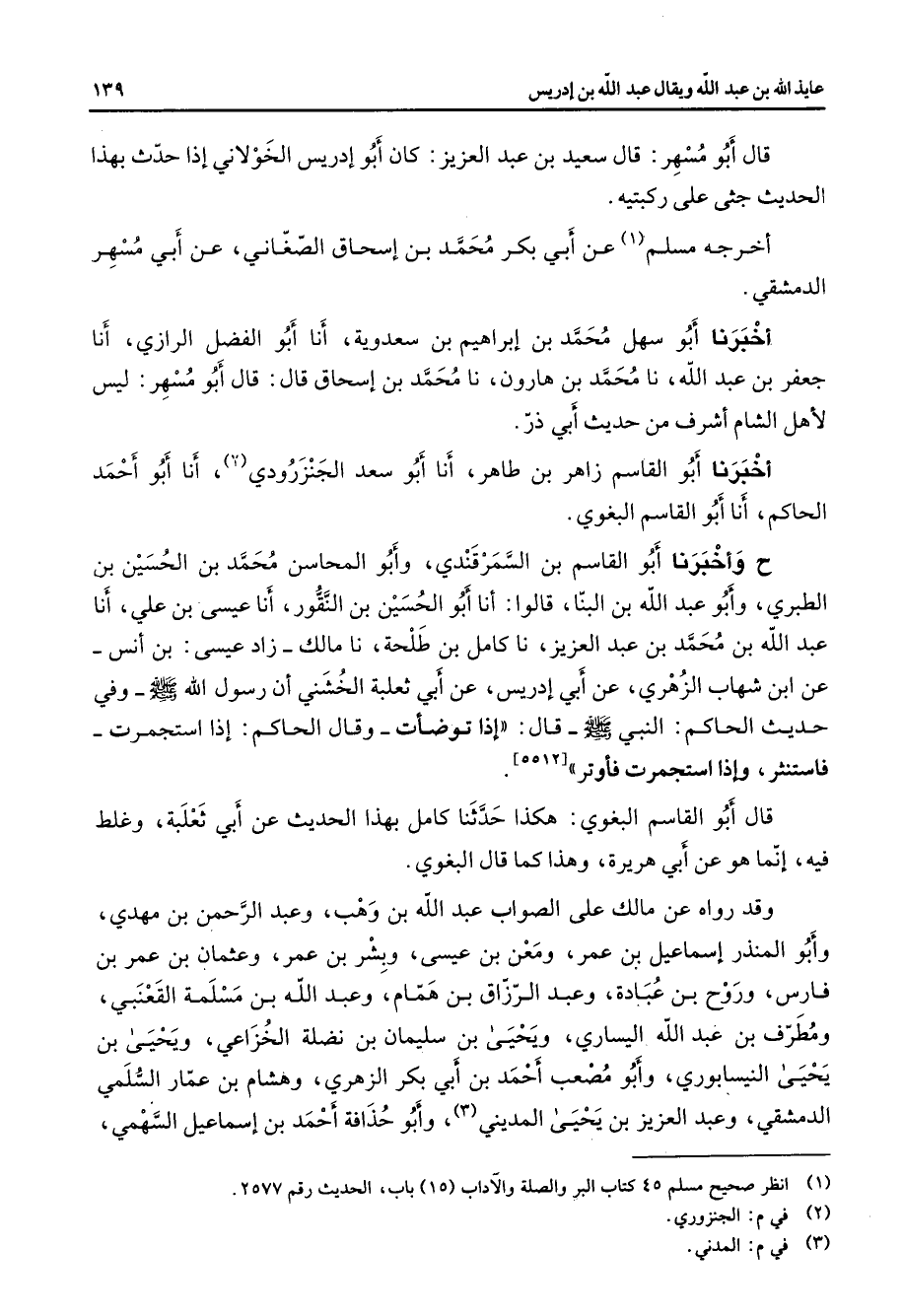 قال أبو مسهر قال سعيد بن عبد العزيز كان أبو إدريس الخولاني إذا حدث بهذا الحديث جثى على ركبتيه أخرجه مسلم (1) عن أبي بكر محمد بن إسحاق الصغاني عن أبي مسهر الدمشقي أخبرنا أبو سهل محمد بن إبراهيم بن سعدوية أنا أبو الفضل الرازي أنا جعفر بن عبد الله نا محمد بن هارون نا محمد بن إسحاق قال قال أبو مسهر ليس لأهل الشام أشرف من حديث أبي ذر أخبرنا أبو القاسم زاهر بن طاهر أنا أبو سعد الجنزرودي (2) أنا أبو أحمد الحاكم أنا أبو القاسم البغوي ح وأخبرنا أبو القاسم بن السمرقندي وأبو المحاسن محمد بن الحسين بن الطبري وأبو عبد الله بن البنا قالوا أنا أبو الحسين بن النقور أنا عيسى بن علي أنا عبد الله بن محمد بن عبد العزيز نا كامل بن طحلة نا مالك زاد عيسى بن أنس عن ابن شهاب الزهري عن أبي إدريس عن أبي ثعلبة الخشني أن رسول الله (صلى الله عليه وسلم) وفي حديث الحاكم النبي (صلى الله عليه وسلم) قال إذا توضأت وقال الحاكم إذا استجمرت فاستنثر وإذا استجمرت فأوتر