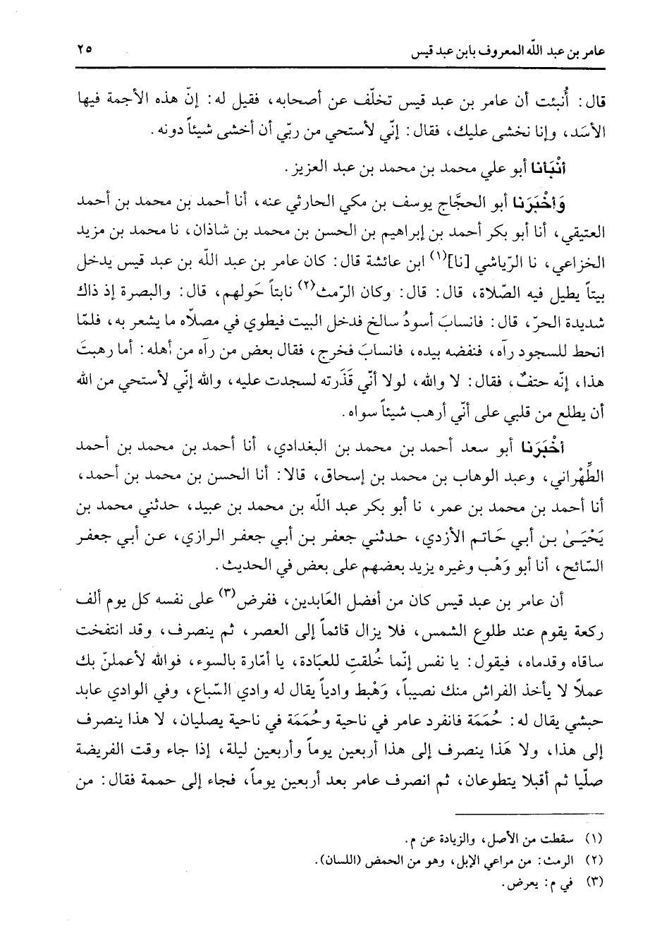 قال أنبئت أن عامر بن عبد قيس تخلف عن أصحابه فقيل له إن هذه الأجمة فيها الأسد وإنا نخشى عليك فقال إني لأستحي من ربي أن أخشى شيئا دونه أنبأنا أبو علي محمد بن محمد بن عبد العزيز وأخبرنا أبو الحجاج يوسف بن مكي الحارثي عنه أنا أحمد بن محمد بن أحمد العتيقي أنا أبو بكر أحمد بن إبراهيم بن الحسن بن محمد بن شاذان نا محمد بن مزيد الخزاعي نا الرياشي نا (1) ابن عائشة قال كان عامر بن عبد الله بن عبد قيس يدخل بيتا يطيل فيه الصلاة قال قال وكان الرمث (2) نابتا حولهم قال والبصرة إذ ذاك شديدة الحر قال فانساب أسود سالخ فدخل البيت فيطوي في مصلاه ما يشعر به فلما انحط للسجود رآه فنفضه بيده فانساب فخرج فقال بعض من رآه من أهله أما رهبت هذا إنه حتف فقال لا والله لولا أني قذرته لسجدت عليه والله إني لأستحي من الله أن يطلع من قلبي على أني أرهب شيئا سواه أخبرنا أبو سعد أحمد بن محمد بن البغدادي أنا أحمد بن محمد بن أحمد الطهراني وعبد الوهاب بن محمد بن إسحاق قالا أنا الحسن بن محمد بن أحمد أنا أحمد بن محمد بن عمر نا أبو بكر عبد الله بن محمد بن عبيد حدثني محمد بن يحيى بن أبي حاتم الأزدي حدثني جعفر بن أبي جعفر الرازي عن أبي جعفر السائح أنا أبو وهب وغيره يزيد بعضهم على بعض في الحديث أن عامر بن عبد قيس كان من أفضل العابدين ففرض (3) على نفسه كل يوم ألف ركعة يقوم عند طلوع الشمس فلا يزال قائما إلى العصر ثم ينصرف وقد انتفخت ساقاه وقدماه فيقول يا نفس إنما خلقت للعبادة يا أمارة بالسوء فوالله لأعملن بك عملا لا يأخذ الفراش منك نصيبا وهبط واديا يقال له وادي السباع وفي الوادي عابد حبشي يقال له حممة فانفرد عامر في ناحية وحممة في ناحية يصليان لا هذا ينصرف إلى هذا ولا هذا ينصرف إلى هذا أربعين يوما وأربعين ليلة إذا جاء وقت الفريضة صليا ثم أقبلا يتطوعان ثم انصرف عامر بعد أربعين يوما فجاء إلى حممة فقال من