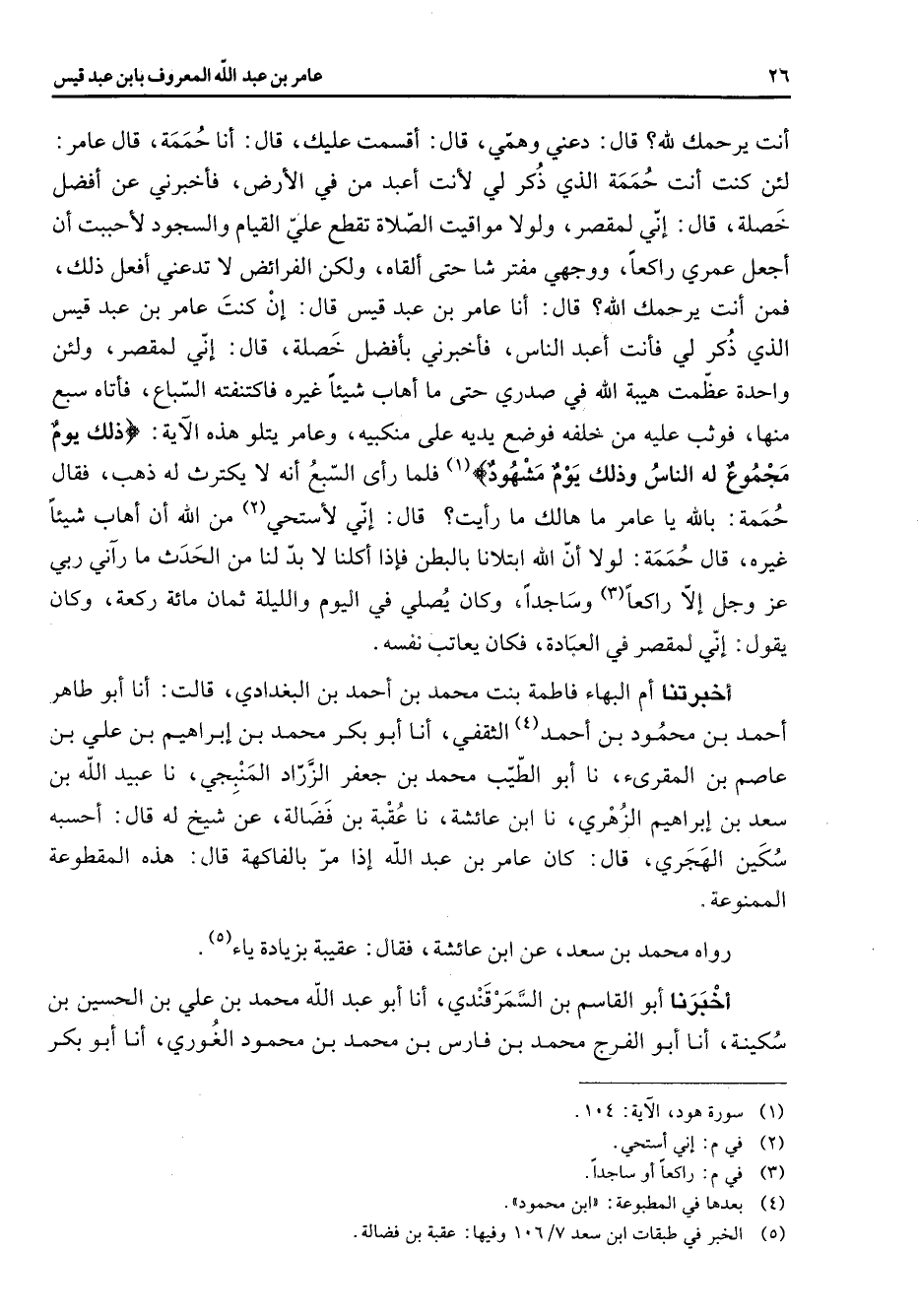 أنت يرحمك الله قال دعني وهمي قال أقسمت عليك قال أنا حممة قال عامر لئن كنت أنت حممة الذي ذكر لي لأنت أعبد من في الأرض فأخبرني عن أفضل خصلة قال إني لمقصر ولولا مواقيت الصلاة تقطع علي القيام والسجود لأحببت أن أجعل عمري راكعا ووجهي مفترشا حتى ألقاه ولكن الفرائض لا تدعني أفعل ذلك فمن أنت يرحمك الله قال أنا عامر بن عبد قيس قال إن كنت عامر بن عبد قيس الذي ذكر لي فأنت أعبد الناس فأخبرني بأفضل خصلة قال إني لمقصر ولئن واحدة عظمت هيبة الله في صدري حتى ما أهاب شيئا غيره فاكتنفته السباع فأتاه سبع منها فوثب عليه من خلفه فوضع يديه على منكبيه وعامر يتلو هذه الآية " ذلك يوم مجموع له الناس وذلك يوم مشهود " (1) فلما رأى السبع أنه لا يكترث له ذهب فقال حممة بالله يا عامر ما هالك ما رأيت قال إني لأستحي (2) من الله أن أهاب شيئا غيره قال حممة لولا أن الله ابتلانا بالبطن فإذا أكلنا لابد لنا من الحدث ما رآني ربي عز وجل إلا راكعا (3) وساجدا وكان يصلي في اليوم والليلة ثمان مائة ركعة وكان يقول إني لمقصر في العبادة فكان يعاتب نفسه أخبرتنا أم البهاء فاطمة بنت محمد بن أحمد بن البغدادي قالت أنا أبو طاهر